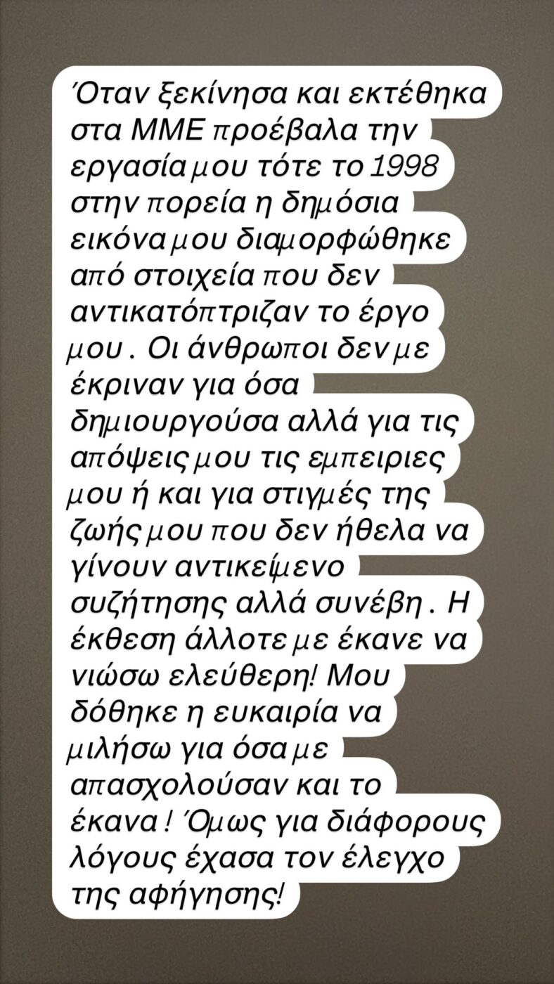 Σχεδόν 40 ημέρες μετά τον θάνατο του Αλέξη Κούγια, η Εύη Βατίδου δημοσίευσε ένα μακροσκελές μήνυμα στον προσωπικό της λογαριασμό στο Instagram, σχετικά με τη δημόσια εικόνα της όταν ξεκίνησε την καριέρα της και σήμερα, μετά τον γάμο και το διαζύγιο της.