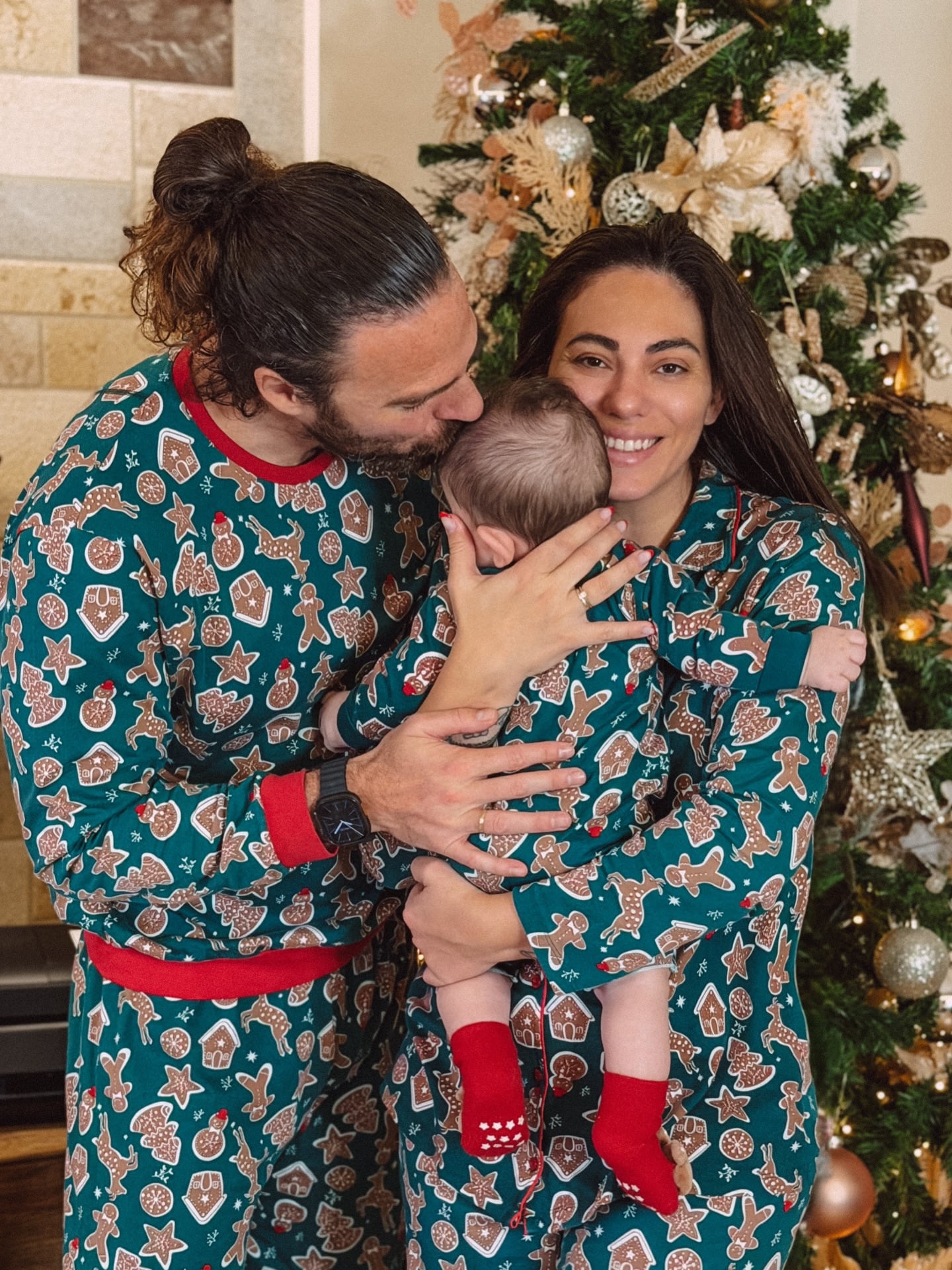 Στη φωτογραφία, η ίδια, ο σύζυγός της Γρηγόρης Μόργκαν και ο νεογέννητος γιος τους ποζάρουν μπροστά στο χριστουγεννιάτικο δέντρο, φορώντας τα ίδια ρούχα.