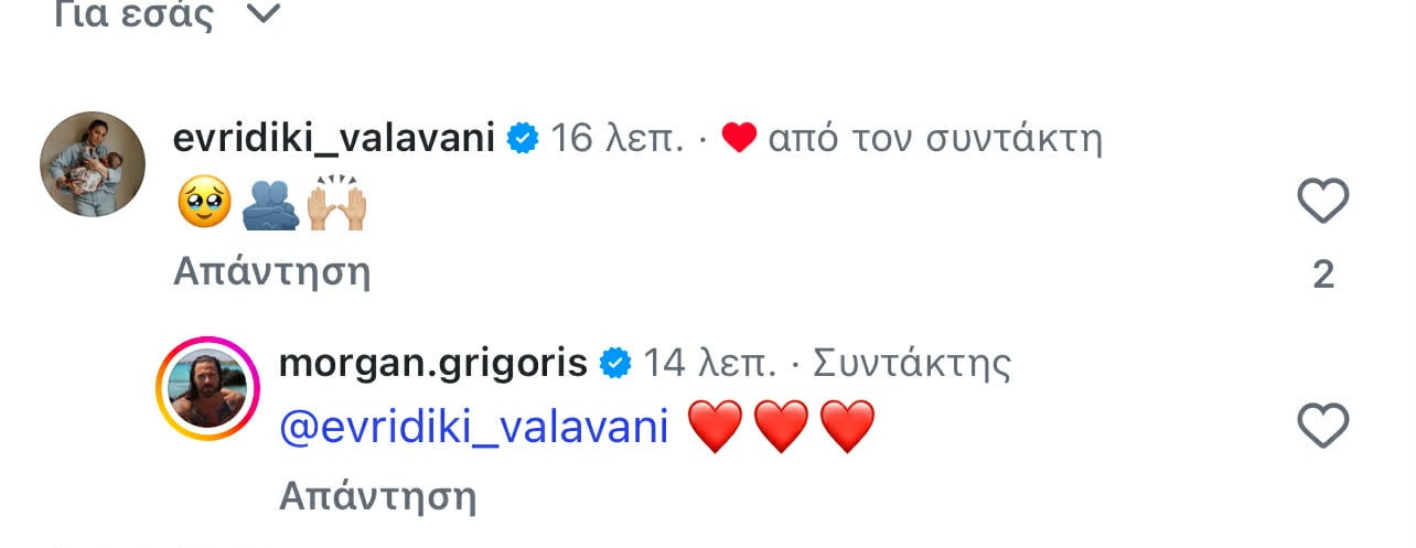 Να θυμίσουμε ότι η Ευρυδίκη Βαλαβάνη και ο Γρηγόρης Μόργκαν παντρεύτηκαν τον Σεπτέμβριο του 2025. Το καλοκαίρι του ίδιου έτους το ζευγάρι απέκτησε το πρώτο του παιδί.