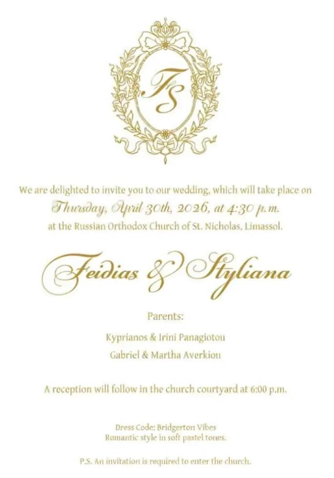 Παντρεύονται ο Φειδίας Παναγιώτου και η Στυλιάνα Αβερκίου στις 30 Απριλίου, σύμφωνα με το προσκλητήριο του γάμου τους, που δημοσιεύτηκε στην κυπριακή ιστοσελίδα reporter.com.cy.