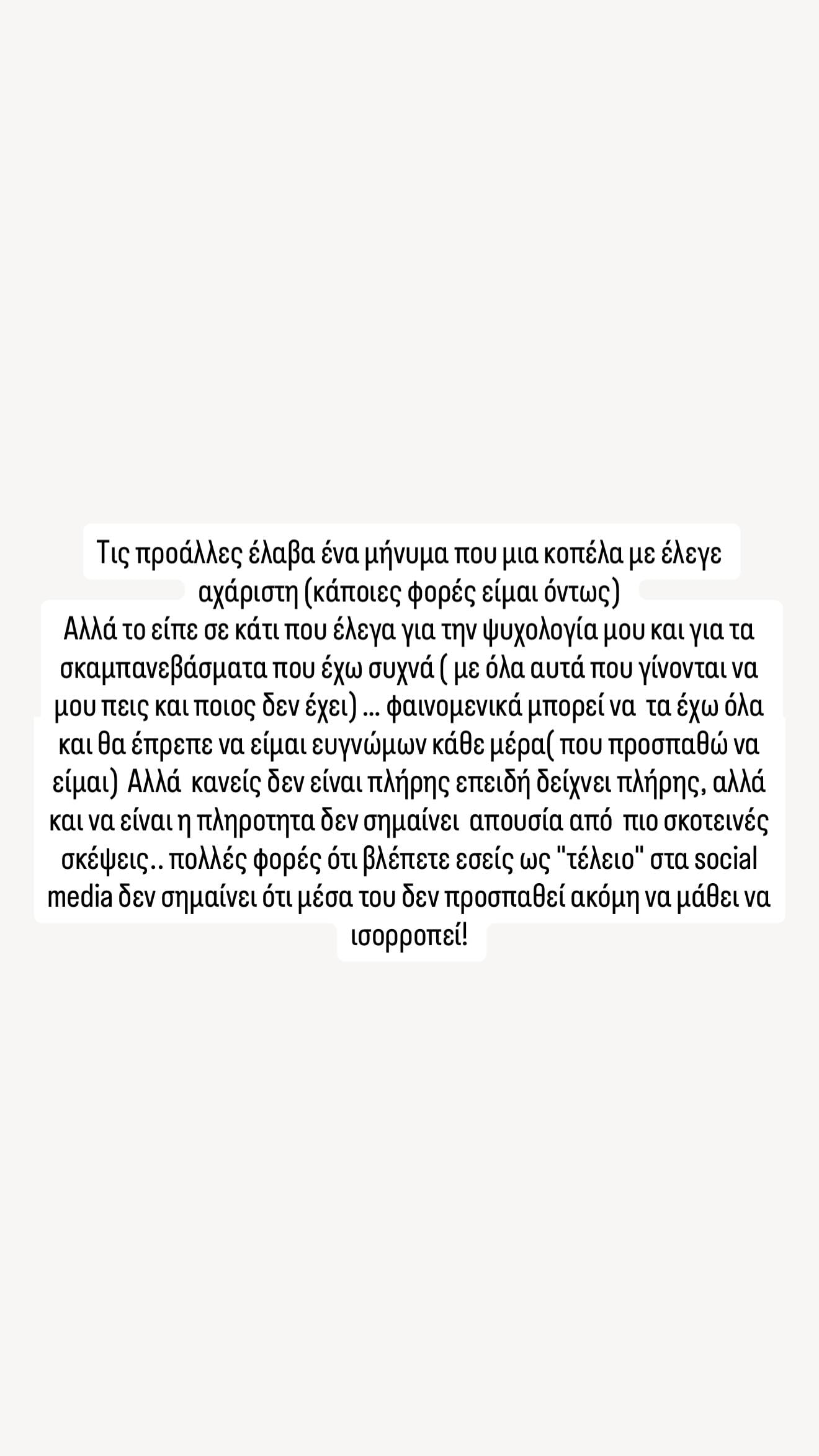 Αλλά κανείς δεν είναι πλήρης επειδή δείχνει πλήρης, αλλά και να είναι πληρότητα δε σημαίνει απουσία από πιο σκοτεινές σκέψεις. Πολλές φορές ό,τι βλέπετε εσείς ως “τέλειο” στα social media, δε σημαίνει ότι μέσα του δε προσπαθεί ακόμα να μάθει να ισορροπεί» έγραψε στην ανάρτησή της η Γαρυφαλλιά Καληφώνη.