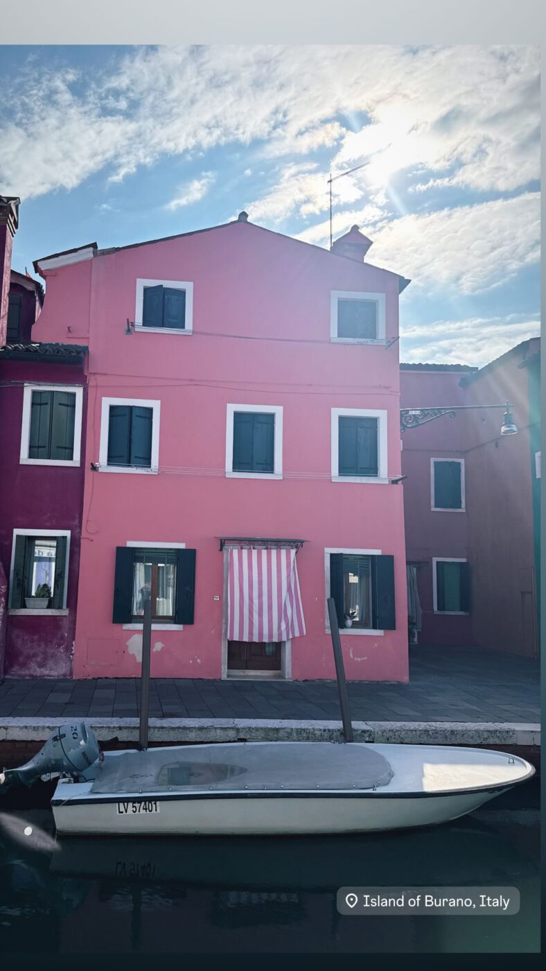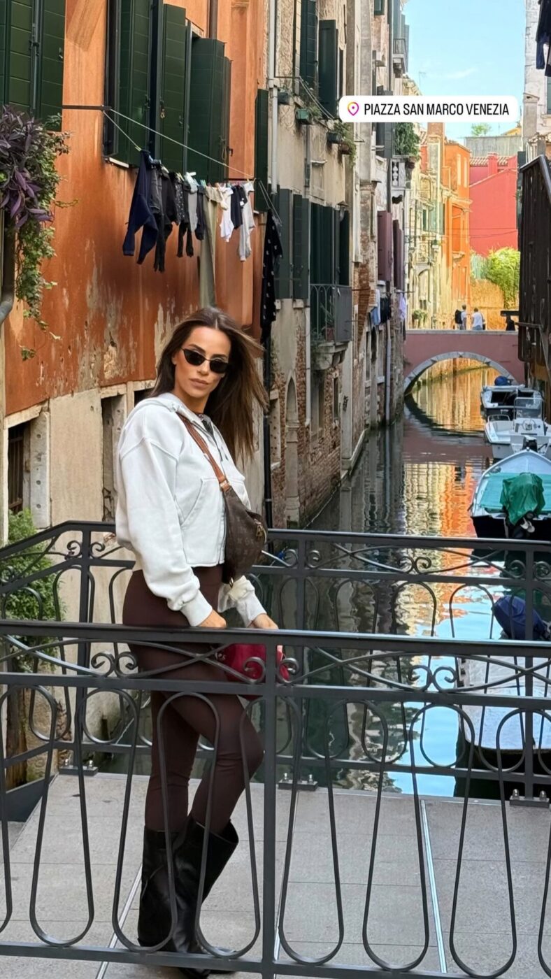 Στις αναρτήσεις της Μαρίας Αντωνά διακρίνονται γραφικές γόνδολες, στενά σοκάκια και στιγμές χαλάρωσης, με το ζευγάρι να απολαμβάνει την ιδιαίτερη ατμόσφαιρα της «πόλης των καναλιών».