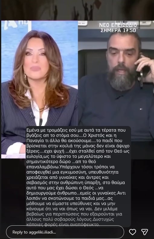 Με αφορμή τις δηλώσεις που έκανε ο Σωτήρης Τσαφούλιας για τις αμβλώσεις, η Αγγελική Ηλιάδη ξέσπασε κατά του σκηνοθέτη.