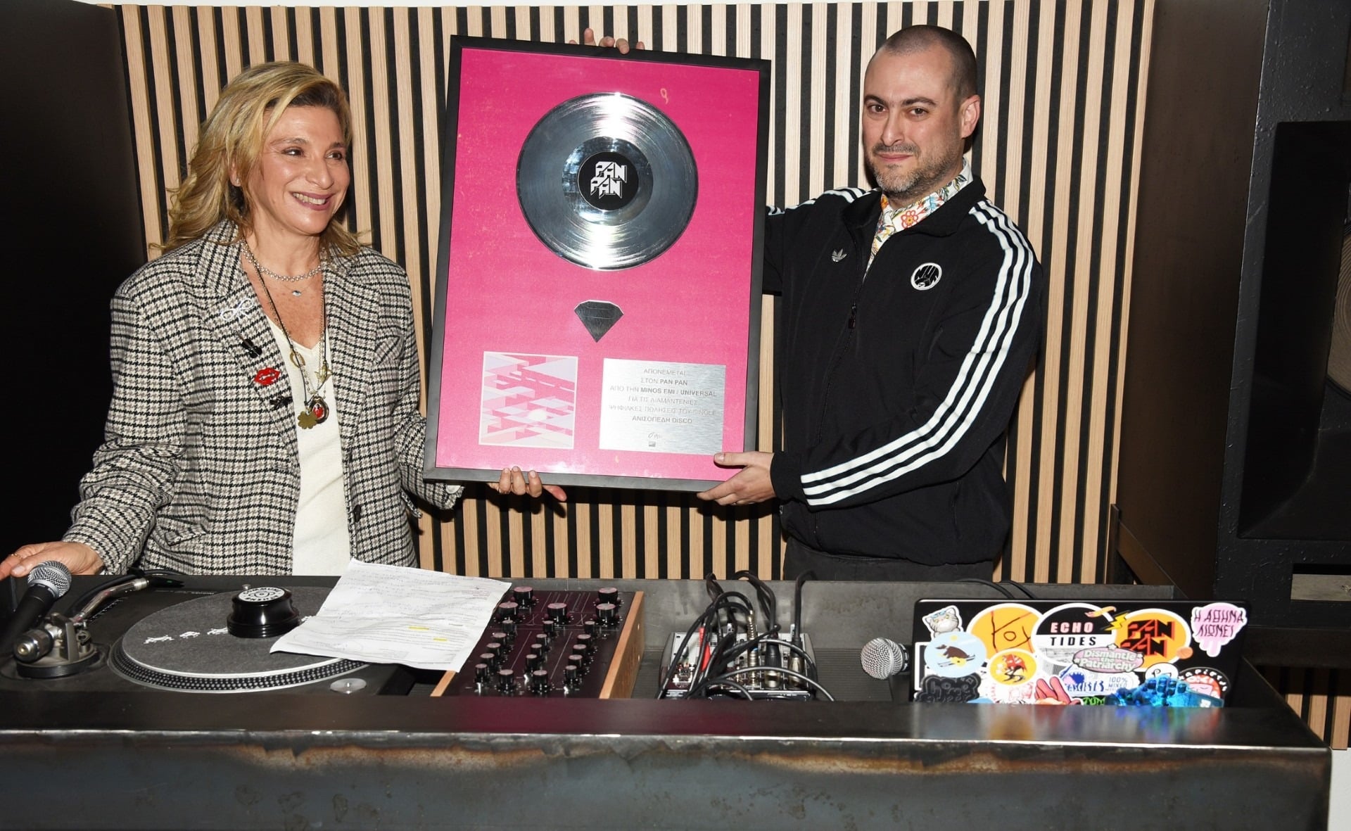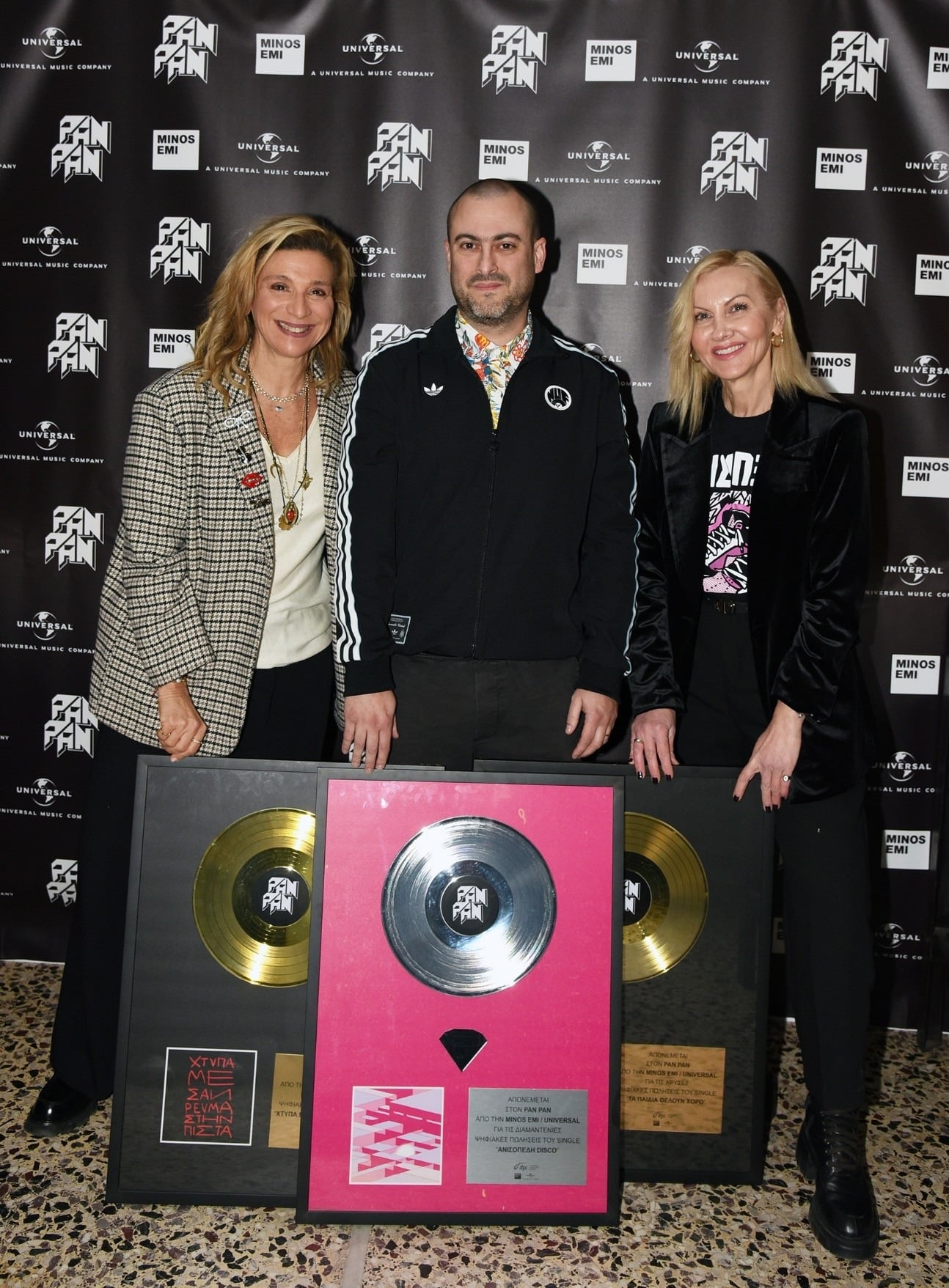 Ο Pan Pan υποδέχτηκε εκλεκτούς καλεσμένους στο Commune Athens, όπου έλαβε τις πλακέτες του από τη Διευθύνουσα Σύμβουλο της Minos EMI, A Universal Music Company Μαργαρίτα Μάτσα. Η «Ανισόπεδη Ντίσκο» έχει κατακτήσει διαμαντένιες ψηφιακές πωλήσεις, το «Χτύπα με σαν ρεύμα στην πίστα» πλατινένιες ψηφιακές πωλήσεις, ενώ «Τα παιδιά θέλουν χορό» χρυσές ψηφιακές πωλήσεις, αποδεικνύοντας πως ο Pan Pan αποτελεί έναν από τους πλέον επιτυχημένους και αγαπητούς εκπρόσωπους της ηλεκτρονικής μουσικής στη χώρα μας.