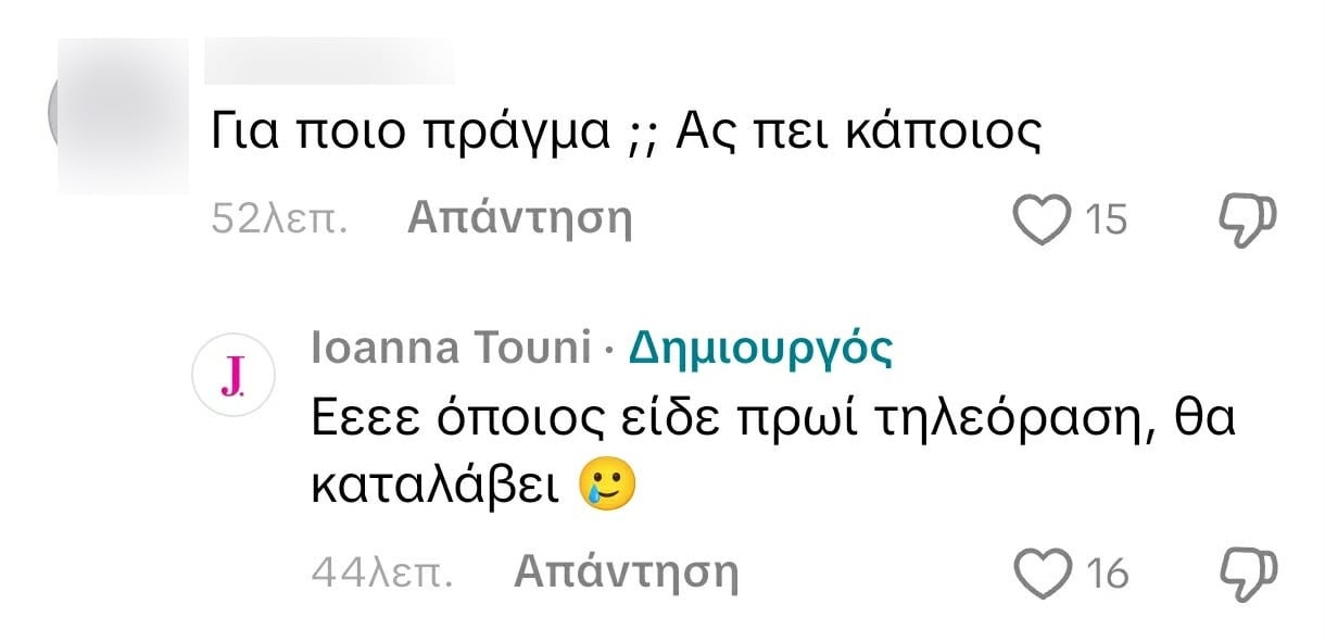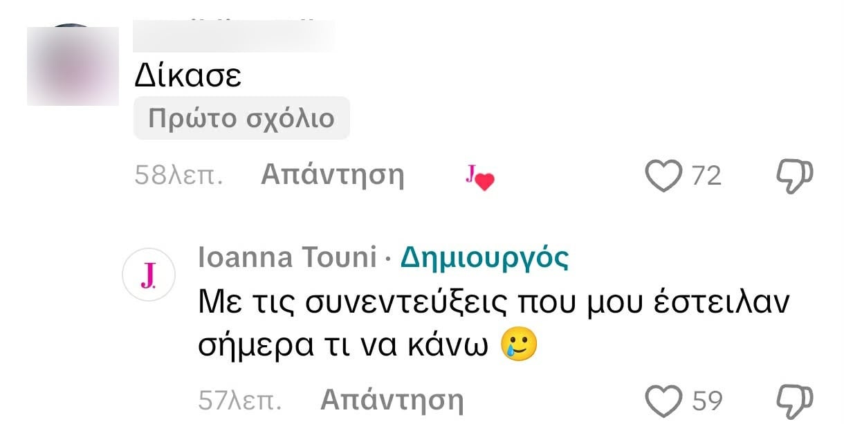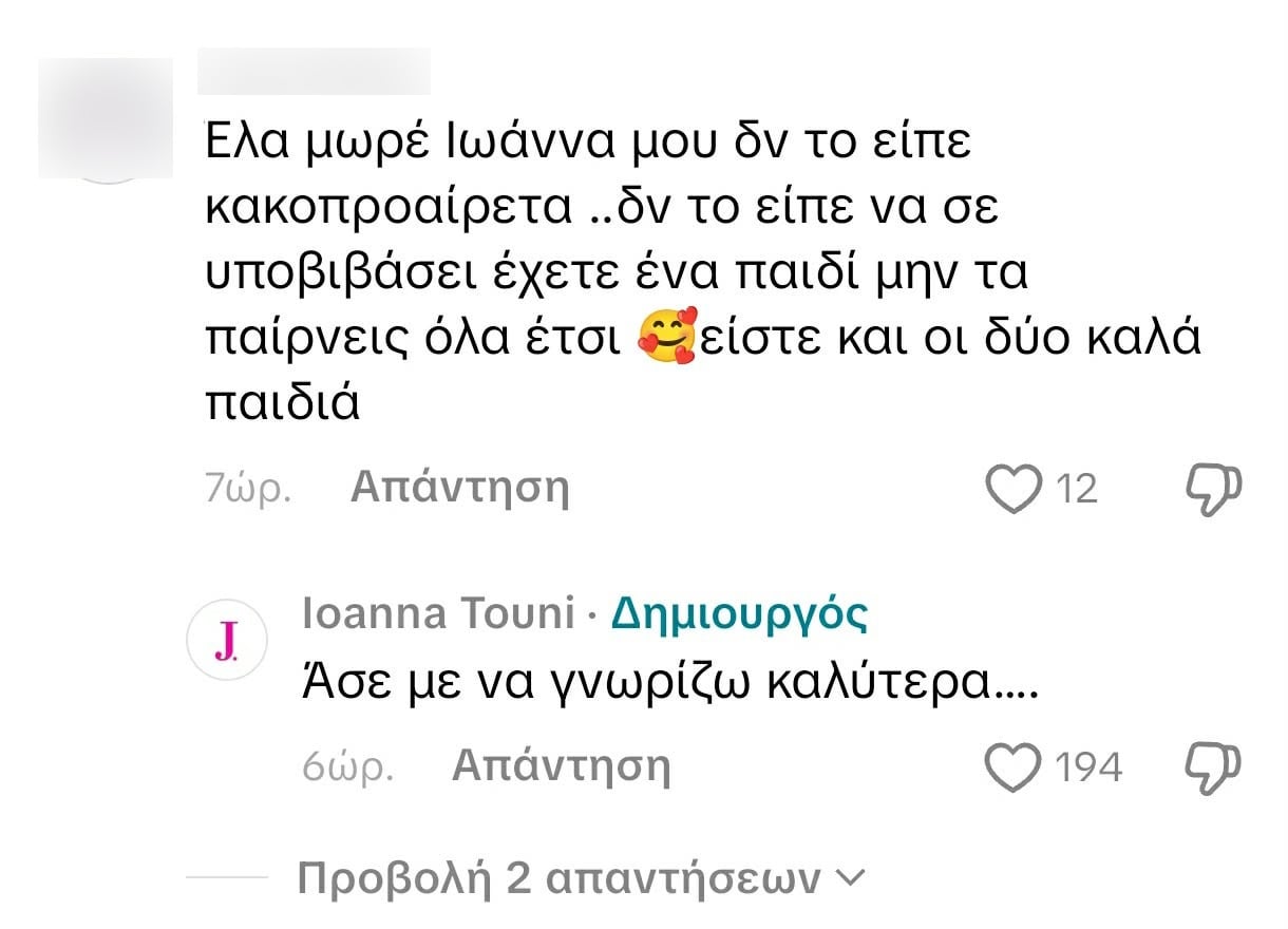 Ωστόσο, το ξέσπασμα δεν έμεινε στο βίντεο καθαυτό. Η Ιωάννα Τούνη απάντησε σχεδόν σε όλα τα σχόλια που της έκαναν οι follower της στο TikTok, τονίζοντας μεταξύ άλλων: «Οι συγκαλυμμένες κακίες είναι οι χειρότερες θα πω εγώ. Να το παίζεις «καλός» ενώ θα έπρεπε να βρεις τρύπα να κρυφτείς μετά τις πράξεις σου… αλλά δεν βαριέσαι. Έχει και η υπομονή όρια… Άσε με να γνωρίζω καλύτερα. Με τις συνεντεύξεις που μου έστειλαν σήμερα τι να κάνω…» γράφει χωρίς κανέναν δισταγμό η Influencer και επιχειρηματίας, αναφερόμενη φυσικά στον Δημήτρη Αλεξάνδρου.