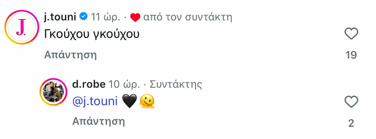 Ποζάροντας μπροστά από τα χαρακτηριστικά πολύχρωμα σπιτάκια, ο νεαρός επιχειρηματίας σχολίασε για πρώτη φορά ανάρτηση της Ιωάννας Τούνη η οποία έγραψε «γκούχου γκούχου», με εκείνον να της απαντά βάζοντας μια καρδιά και ένα emoji που το προσωπάκι που «λιώνει».