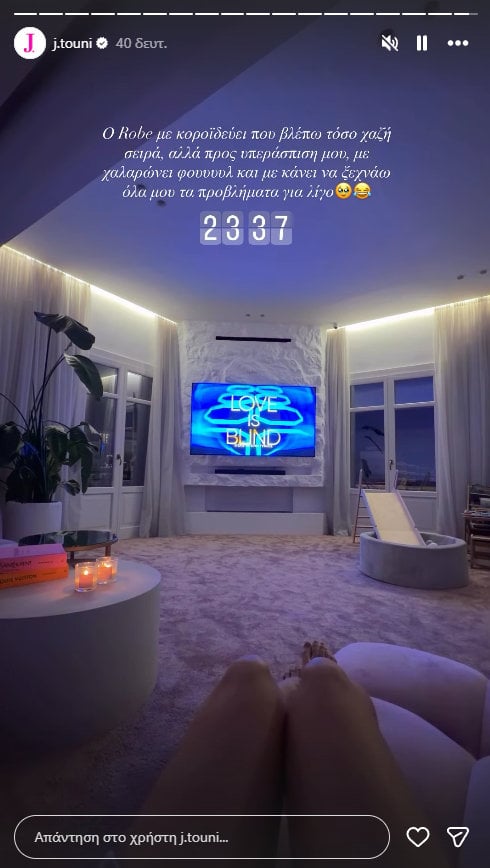 Στο νέο της story στο instagram το βράδυ της Καθαράς Δευτέρας η γνωστή influencer αναφέρθηκε στον σύντροφό της, με αφορμή τη σειρά που παρακολουθεί:  «Με κοροϊδεύει που βλέπω τόσο χαζή σειρά, αλλά προς υπεράσπισή μου, με χαλαρώνει φουλ και με κάνει να ξεχνάω όλα μου τα προβλήματα».