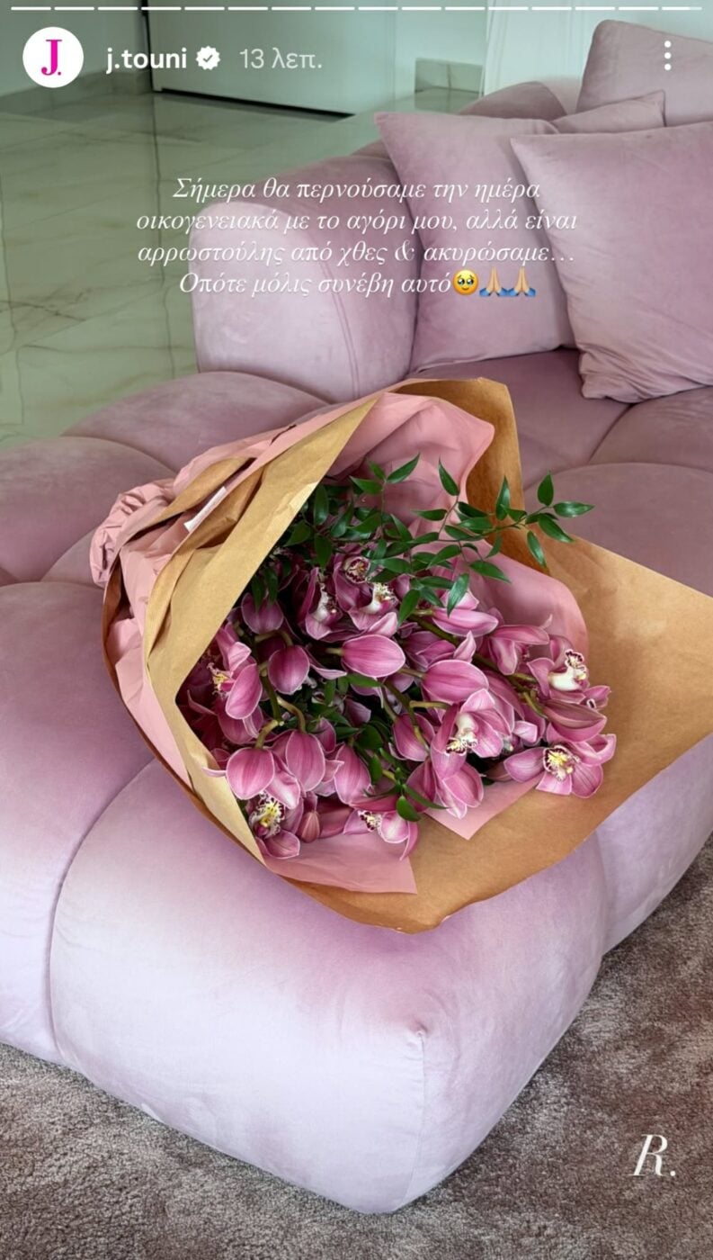 «Σήμερα θα περνούσαμε την ημέρα οικογενειακά με το αγόρι μου, αλλά είναι αρρωστούλης από χθες και ακυρώσαμε… Οπότε μόλις συνέβη αυτό» έγραψε η Ιωάννα Τούνη, δείχνοντας στους διαδικτυακούς φίλους της την ανθοδέσμη που της έστειλε.
