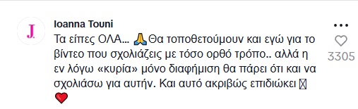 Κάτω από το βίντεο αυτό, σχολίασε η ίδια η Ιωάννα Τούνη γράφοντας, «Τα είπες ΟΛΑ… Θα τοποθετούμουν και εγώ για το βίντεο που σχολιάζεις με τόσο ορθό τρόπο.. αλλά η εν λόγω «κυρία» μόνο διαφήμιση θα πάρει ότι και να σχολιάσω για αυτήν. Και αυτό ακριβώς επιδιώκει».
