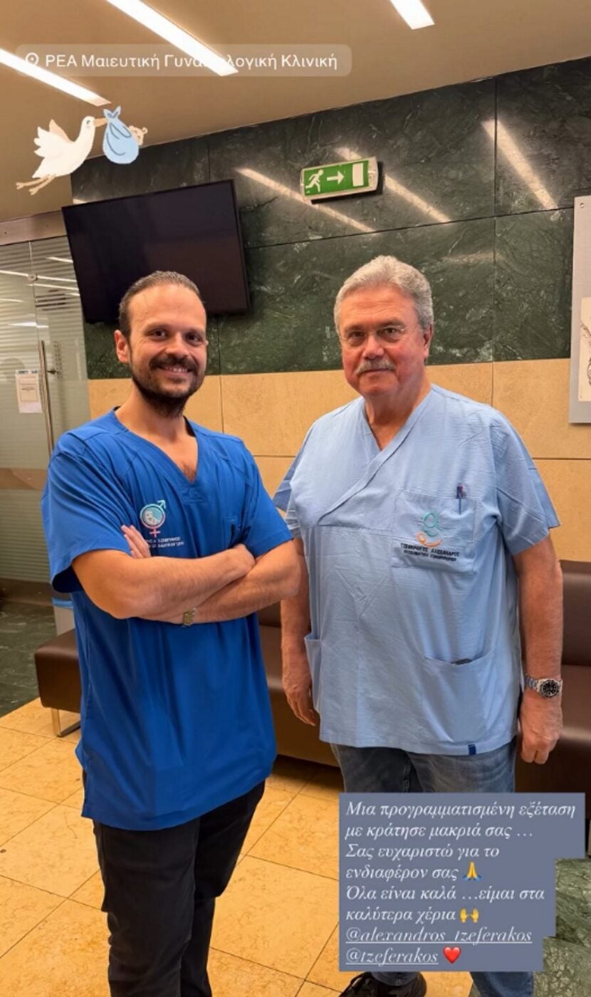 Λίγο πριν τις 13:00, η Κατερίνα Καινούργιου, η οποία διανύει τον 7ο μήνα της εγκυμοσύνης της, μοιράστηκε στα social media μια φωτογραφία μέσα από το νοσοκομείο, όπου ποζάρουν χαμογελαστοί οι γιατροί της.