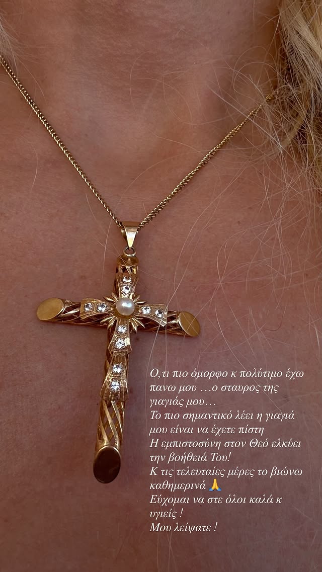 Ίσως το πιο σημαντικό δώρο, αυτό της γιαγιάς της, ένας χρυσός σταυρός: «Ό,τι πιο όμορφο και πολύτιμο έχω πάνω μου… Ο σταυρός της γιαγιάς μου. Το πιο σημαντικό λέει η γιαγιά μου, είναι να έχετε πίστη. Η εμπιστοσύνη στο Θεό ελκύει τη βοήθεια του. Και τις τελευταίες μέρες το βιώνω καθημερινά. Εύχομαι να είστε όλοι καλά και υγιείς. Μου λείψατε», έγραψε η Κατερίνα Καινούργιου.