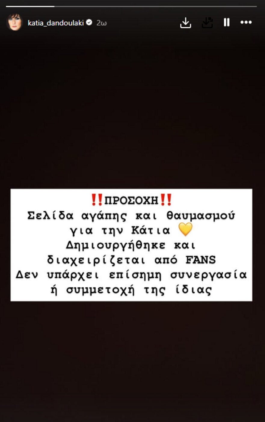 Ο γνωστός δημοσιογράφος και παρουσιαστής αποκάλυψε πως η ηθοποιός επικοινώνησε με τους διαχειριστές και τους εξέφρασε την έντονη ενόχλησή της. Η ενόχληση της Κάτιας Δανδουλάκη ήταν ότι στο συγκεκριμένο προφίλ δεν υπήρχε πουθενά η ένδειξη ότι πρόκειται για fan club και όλοι νόμιζαν ότι πρόκειται για το δικό της προσωπικό προφίλ.
