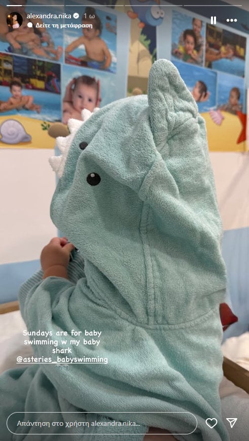 Μέσα από τα social media, η Αλεξάνδρα Νίκα μοιράζεται σχεδόν καθημερινά φωτογραφίες με τον μικρό της. Την Κυριακή 26 Οκτωβρίου η σύζυγος του Κωνσταντίνου Αργυρού δημοσίευσε φωτογραφία με τον γιο της στο ιδιαίτερο μπουρνούζι του στα μαθήματα baby swimming.