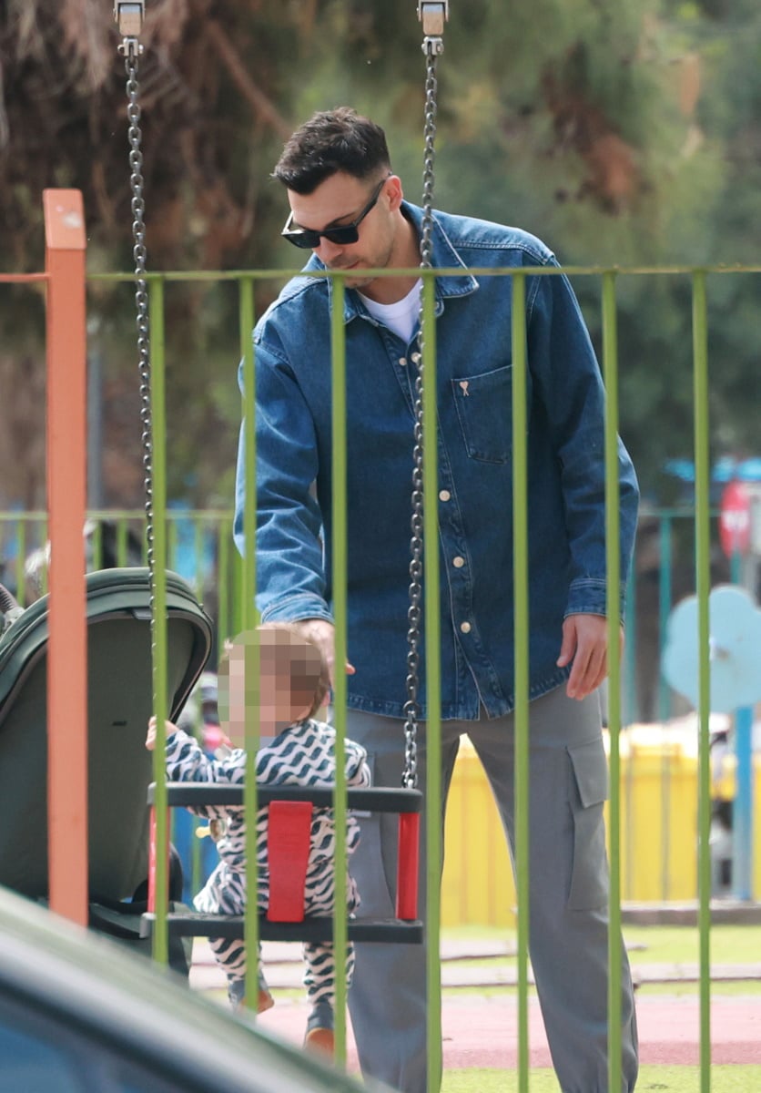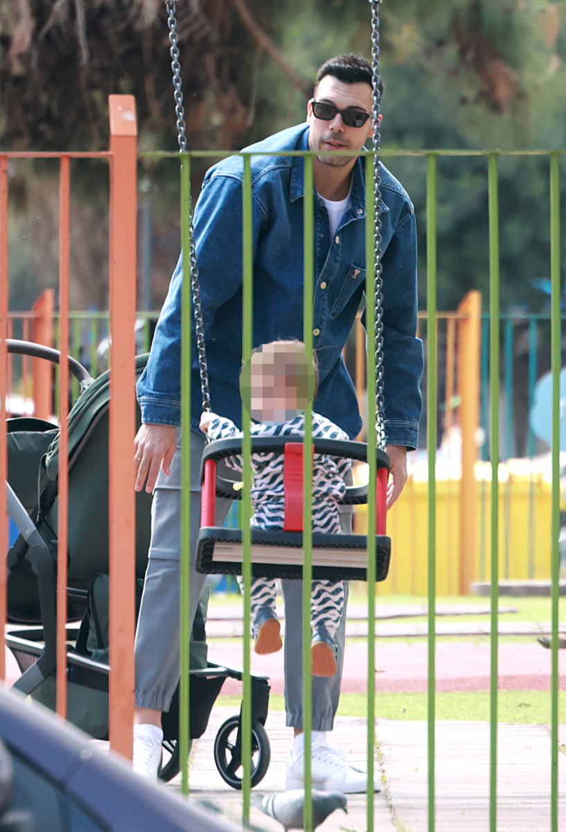 Στις φωτογραφίες που ακολουθούν βλέπουμε τον Κώστα Σλούκα με τη σύζυγό του, Μαρία Δαρσινού και τον γιο τους να απολαμβάνουν τη βόλτα τους σε παιδική χαρά της Γλυφάδας.