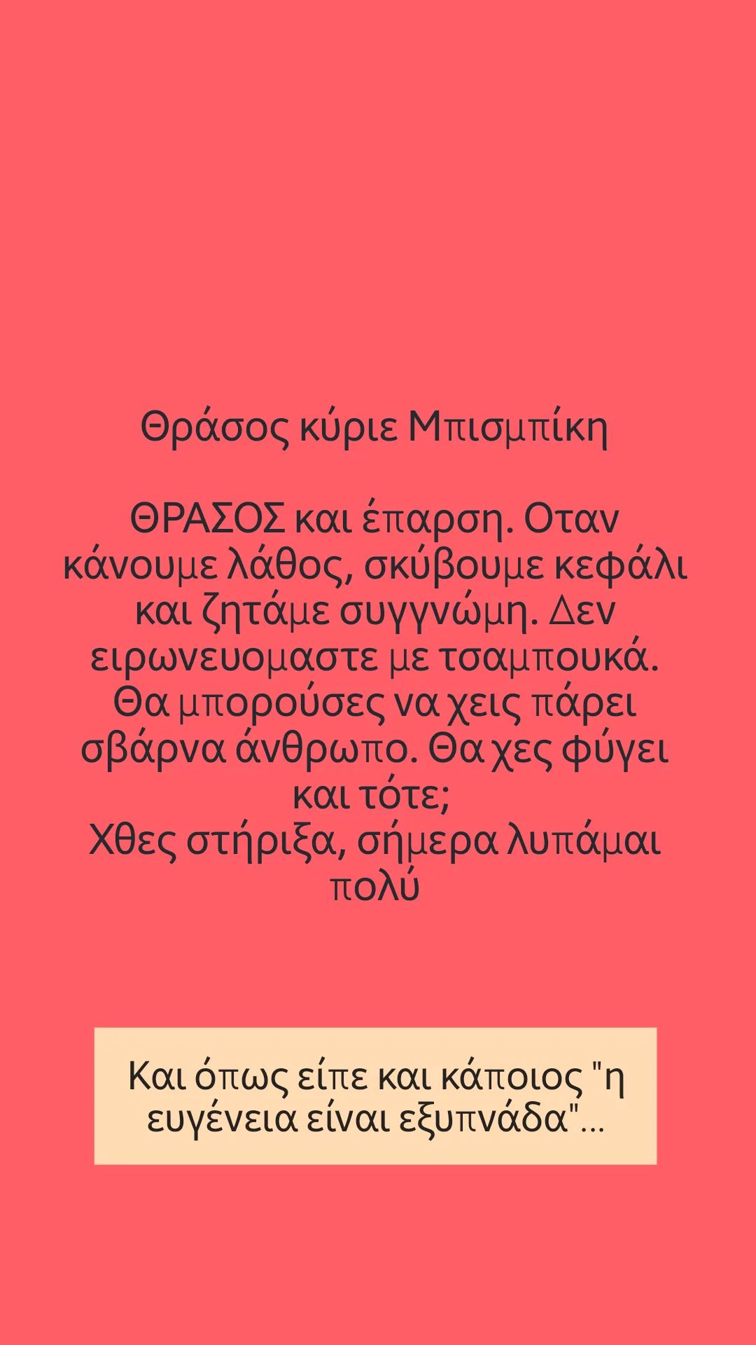 - Ο Κωνσταντάρας χαρακτήρισε τη στάση του Μπισμπίκη αλαζονική και υπογράμμισε τη σημασία της συγγνώμης.