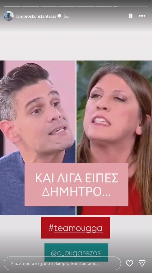 Ο Λάμπρος Κωνσταντάρας με ανάρτησή του στο instagram στηρίζει τον Δημήτρη Ουγγαρέζο μετά τον άγριο καβγά στον αέρα του Mega με τη Ζωή Κωνσταντοπούλου.