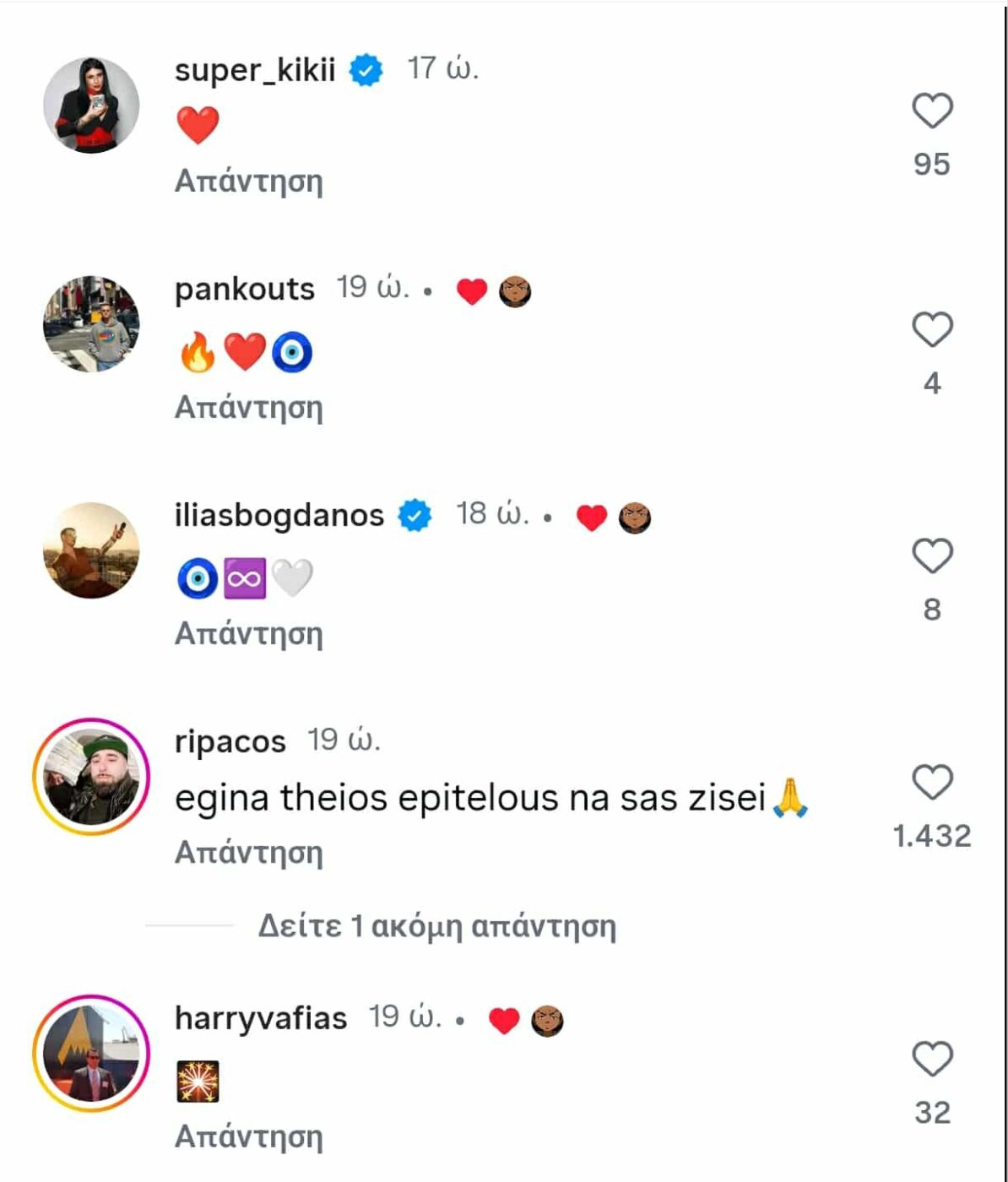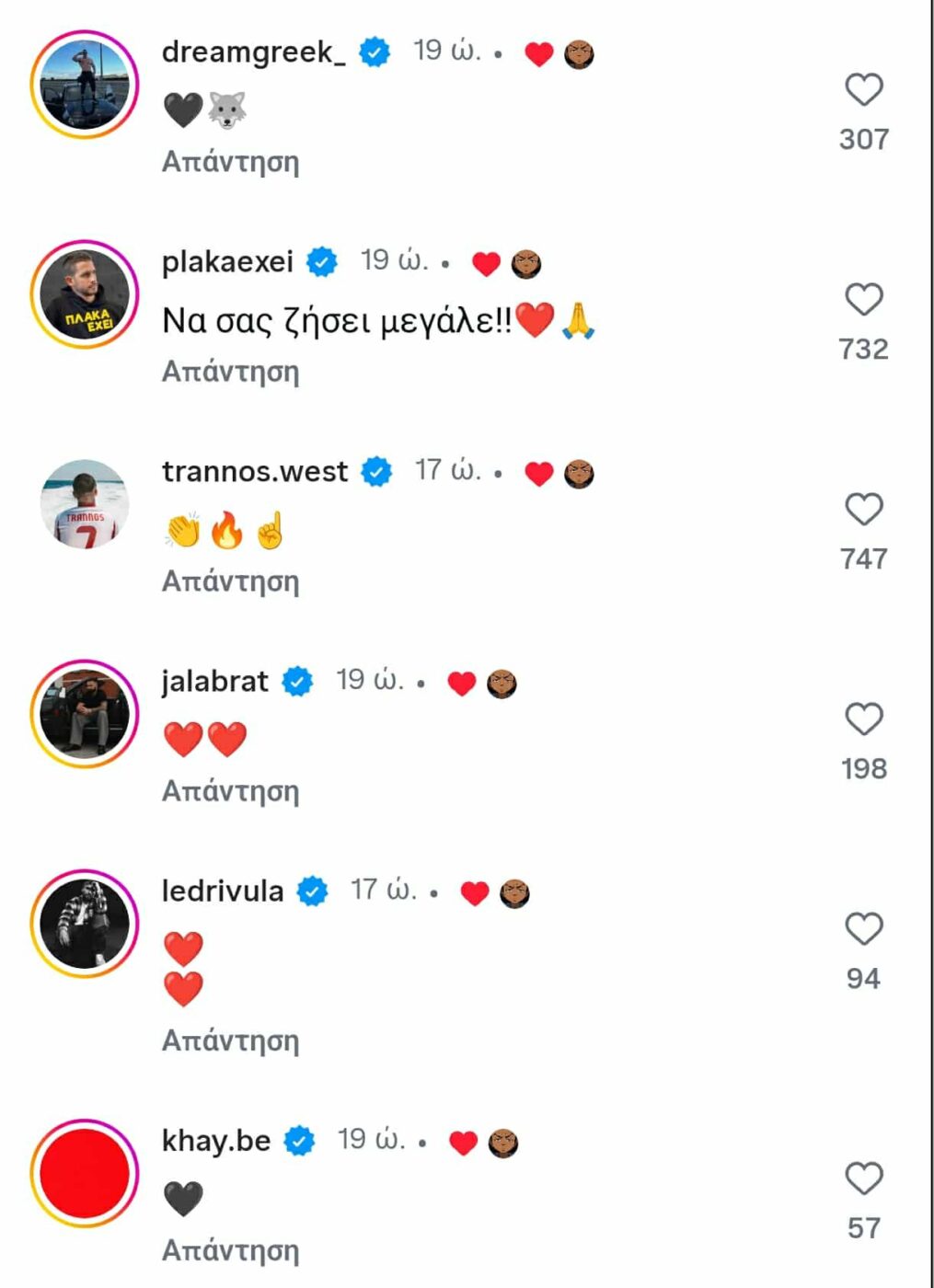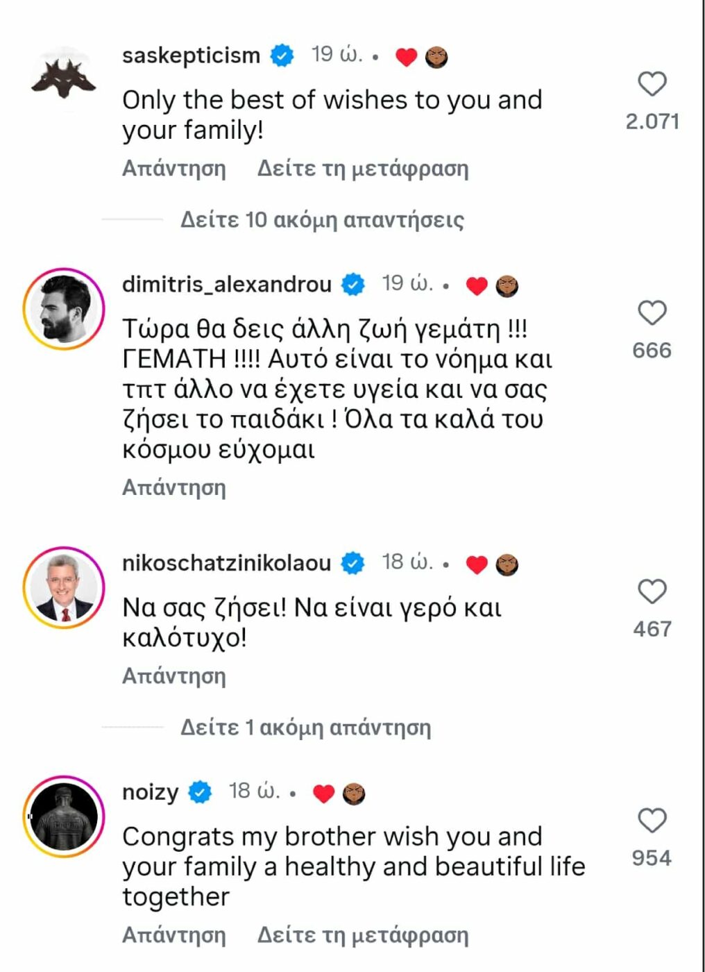 Μάλιστα, κάτω από τις αναρτήσεις του ζευγαριού, επώνυμοι φίλοι και συνεργάτες τους, δημοσιογράφοι, τραγουδιστές και TikTokers εύχονται στον Light και την Άννα για τη γέννηση του γιου τους.