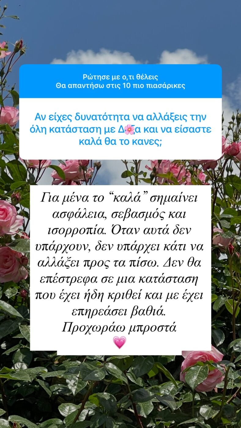 «Για μένα το «καλά» σημαίνει ασφάλεια, σεβασμός και ισορροπία. Όταν αυτά δεν υπάρχουν, δεν υπάρχει κάτι να αλλάξει προς τα πίσω. Δεν θα επέστρεφα σε μια κατάσταση που έχει ήδη κριθεί και με έχει επηρεάσει βαθιά. Προχωράω μπροστά» απάντησε η πρώην σύζυγός του Κώστα Δόξα.