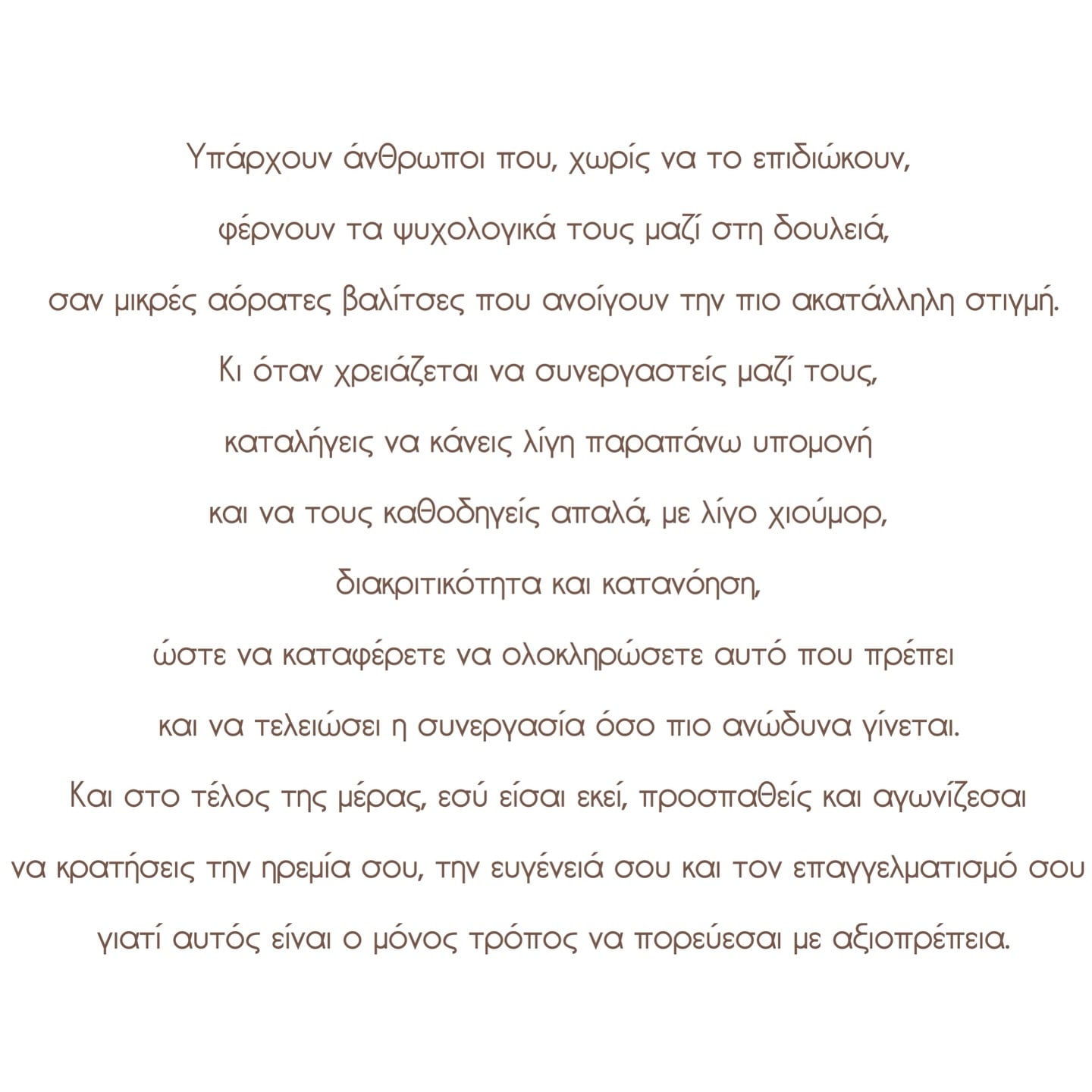 «Υπάρχουν άνθρωποι που, χωρίς να το επιδιώκουν, φέρνουν τα ψυχολογικά τους μαζί στη δουλειά, σαν μικρές αόρατες βαλίτσες που ανοίγουν την πιο ακατάλληλη στιγμή. Κι όταν χρειάζεται να συνεργαστείς μαζί τους, καταλήγεις να κάνεις λίγη παραπάνω υπομονή και να τους καθοδηγείς απαλά, με λίγο χιούμορ, διακριτικότητα και κατανόηση, ώστε να καταφέρετε να ολοκληρώσετε αυτό που πρέπει και να τελειώσει η συνεργασία όσο πιο ανώδυνα γίνεται.