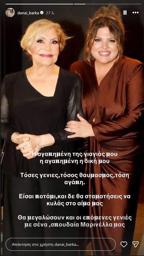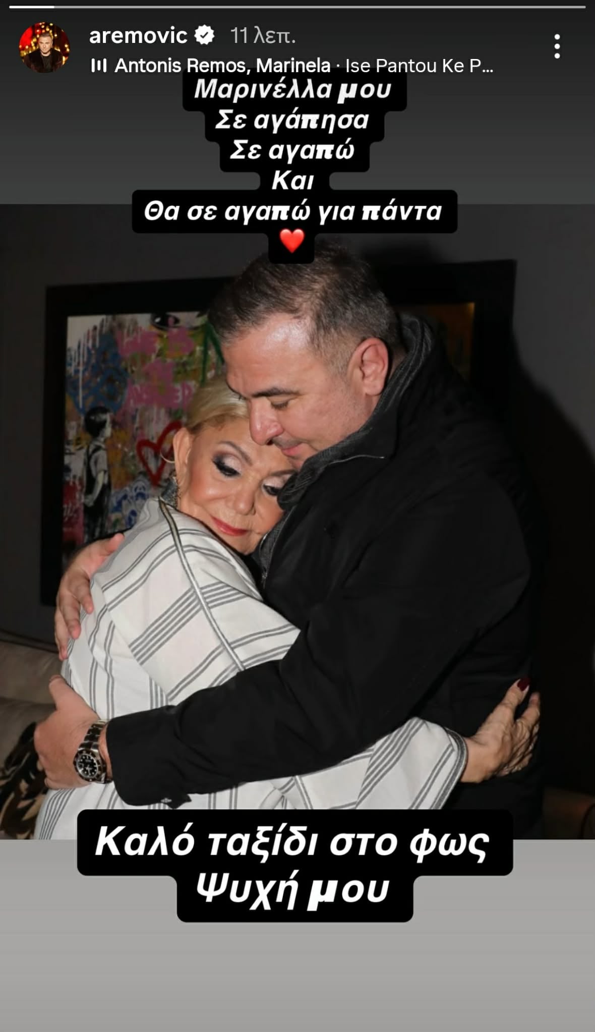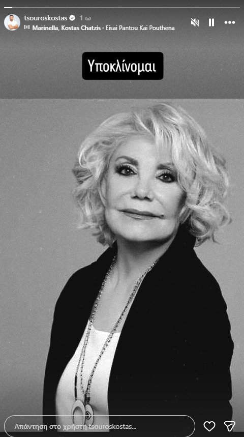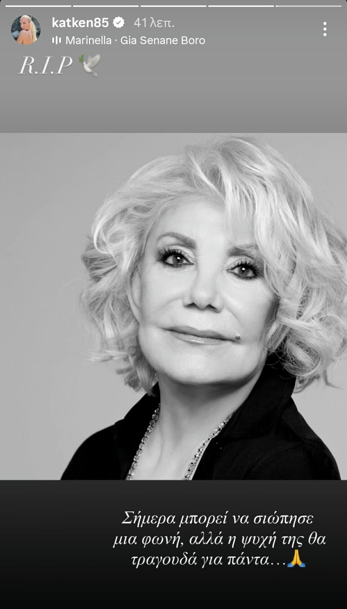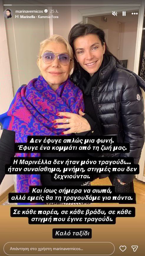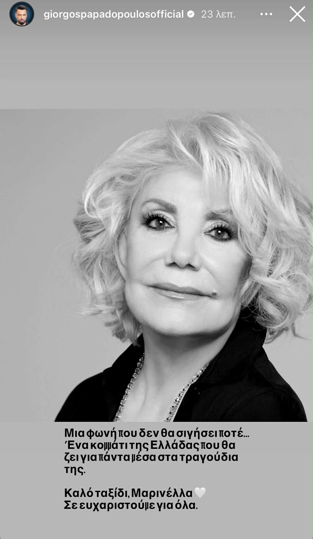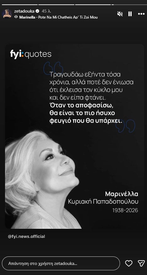 «Με βαθιά θλίψη σας ανακοινώνουμε την απώλεια της Μαρινέλλας, αγαπημένης μας μητέρας και γιαγιάς, η οποία κατέληξε στο σπίτι της, σήμερα 28 Μαρτίου 2026 στις 18:00», αναφέρει η ανακοίνωση για τον θάνατο της σπουδαίας ερμηνεύτριας.
