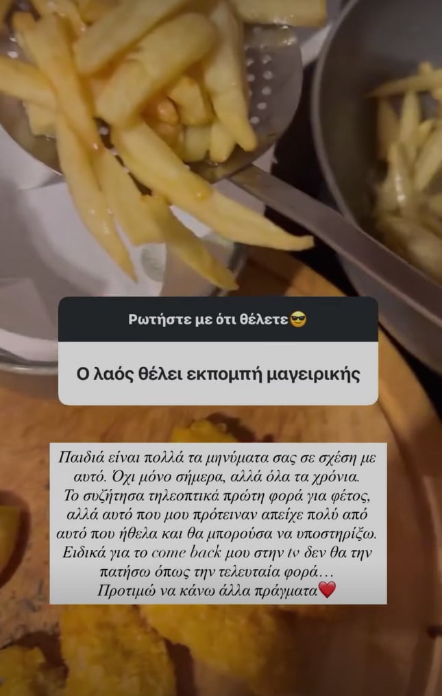 Η γνωστή παρουσιάστρια αποκάλυψε πως πρόσφατα συμμετείχε σε δοκιμαστικό για μια εκπομπή μαγειρικής στον ΑΝΤ1. Ωστόσο, όπως ανέφερε, το συγκεκριμένο πρότζεκτ δεν ταίριαζε με το ύφος και τις ιδέες που είχε η ίδια στο μυαλό της για το τηλεοπτικό της μέλλον.