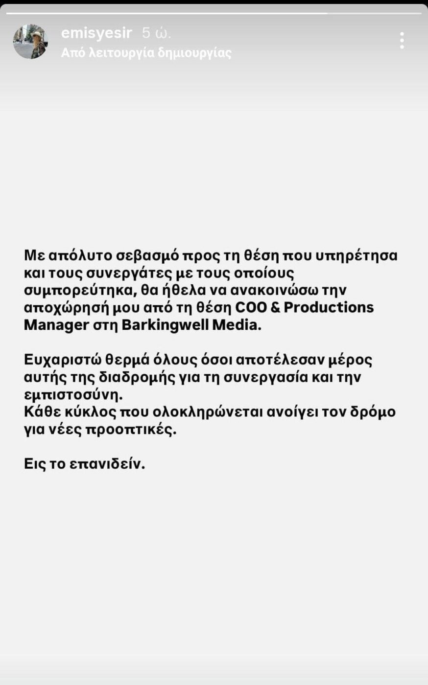 «Με απόλυτο σεβασμό προς τη θέση που υπηρέτησα και τους συνεργάτες με τους οποίους συμπορεύτηκα, θα ήθελα να ανακοινώσω την αποχώρησή μου από τη θέση COO & Productions Manager στην Barkingwell Media. Ευχαριστώ θερμά όλους όλοι αποτέλεσαν μέρος αυτής της διαδρομής για τη συνεργασία και την εμπιστοσύνη. Κάθε κύκλος που ολοκληρώνεται ανοίγει το δρόμο για νέες προοπτικές. Εις το επανιδείν» έγραψε η Εμινέ Γεσίρ στην ανάρτησή της στα Instagram Stories της.