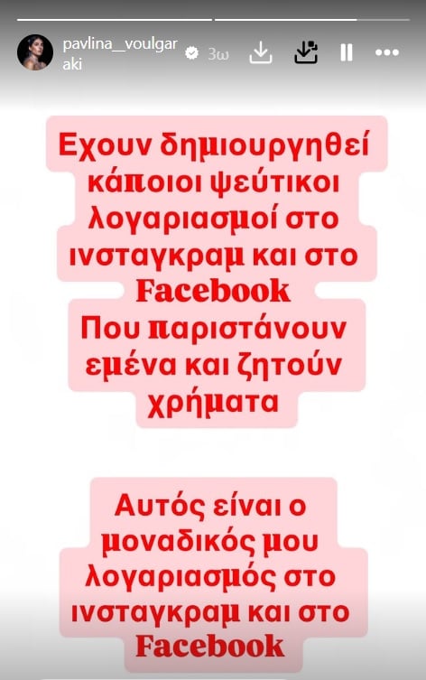 Μέσα από σχετικό story, η Παυλίνα Βουλγαράκη καταγγέλλει το περιστατικό και ξεκαθαρίζει ποιος είναι ο επίσημος λογαριασμός της, καλώντας το κοινό να είναι ιδιαίτερα προσεκτικό.