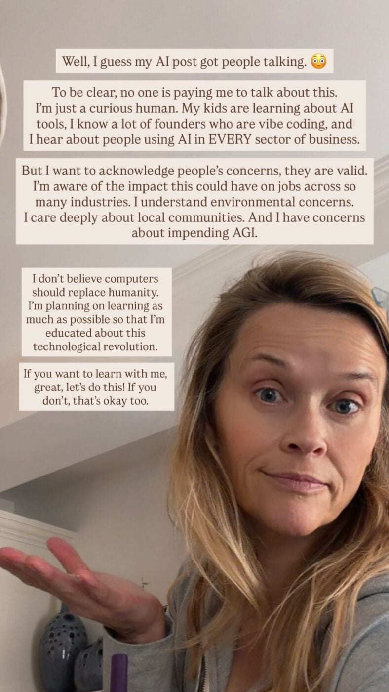 Η Reese Witherspoon τοποθετήθηκε δημόσια μετά τις έντονες αντιδράσεις που προκάλεσαν οι δηλώσεις της υπέρ της τεχνητής νοημοσύνης, ξεκαθαρίζοντας τη στάση της και επιχειρώντας να βάλει τα πράγματα στη θέση τους.
