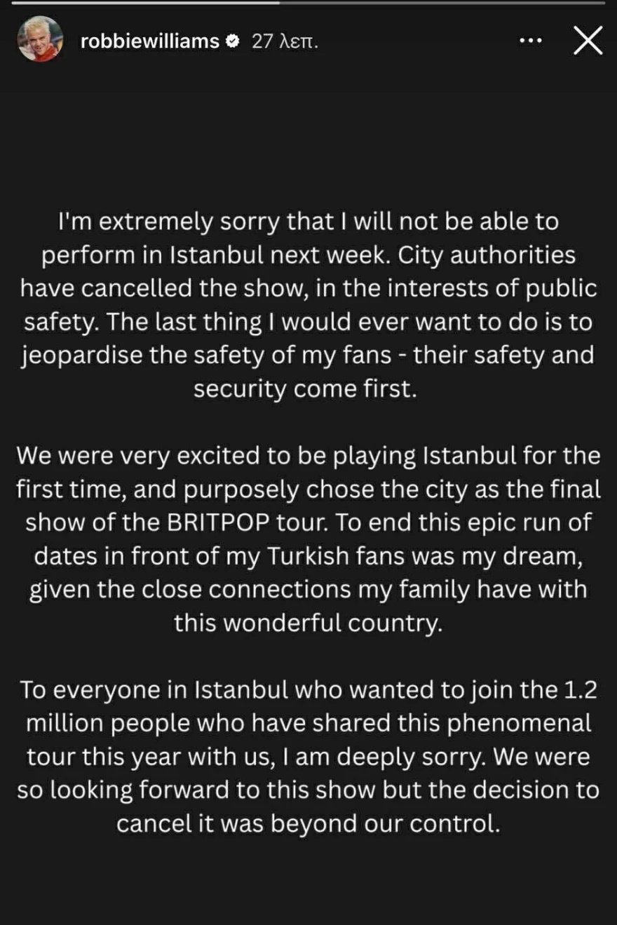 Προσθέτει ότι η Κωνσταντινούπολη θα ήταν ο τελευταίος σταθμός της περιοδείας και μάλιστα ότι θα εμφανιζόταν για πρώτη φορά εκεί. «Λυπάμαι βαθιά. Περιμέναμε αυτή τη συναυλία αλλά η απόφαση να ακυρωθεί ήταν πέρα από τον έλεγχό μας».