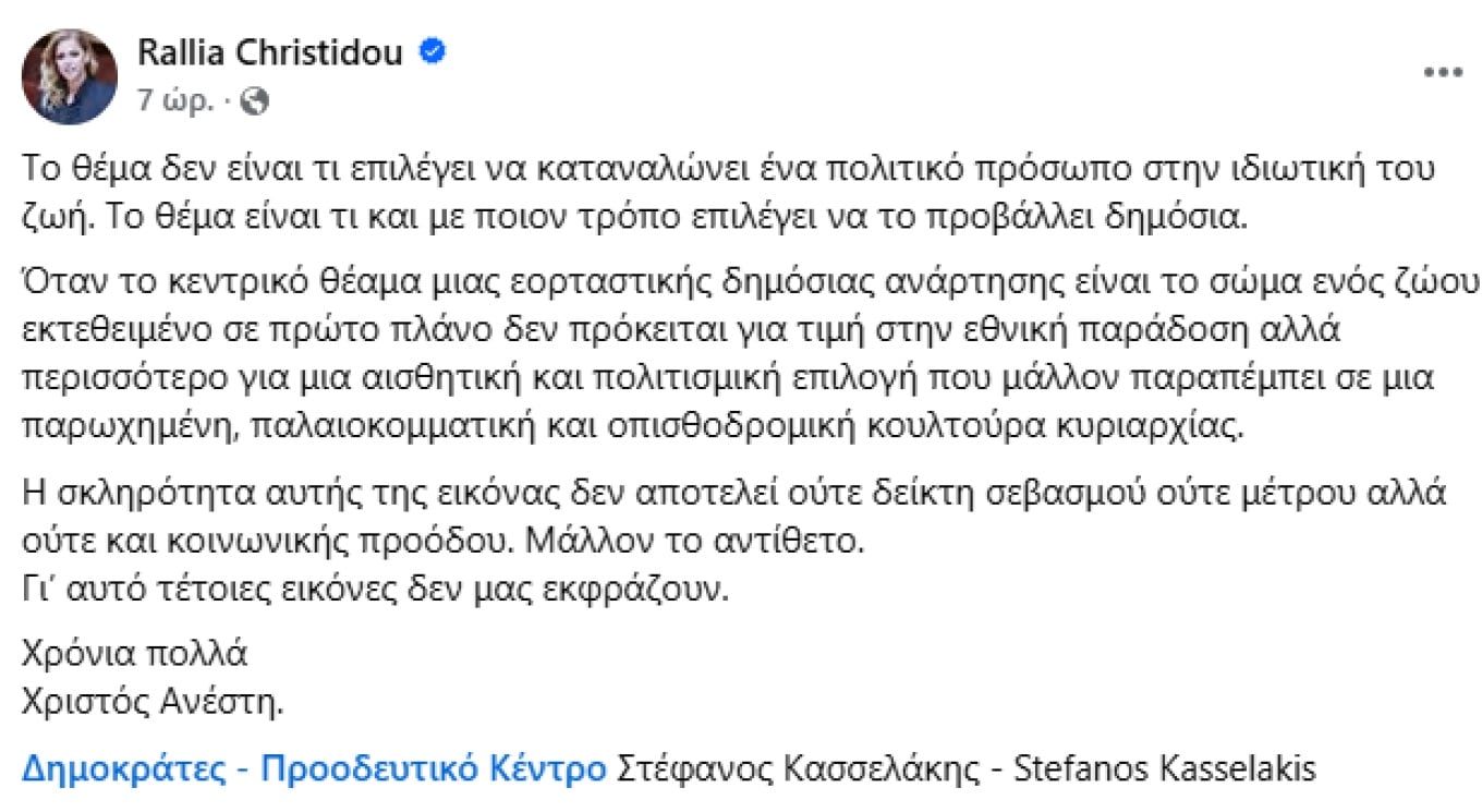 Η Ραλλία Χρηστίδου σχολίασε το post του Κώστα Μπακογιάννη, γράφοντας χαρακτηριστικά: