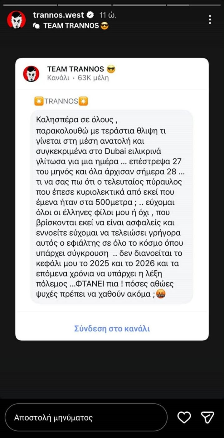 «Καλησπέρα σε όλους, παρακολουθώ με τεράστια θλίψη τι γίνεται στη μέση ανατολή και συγκεκριμένα στο Ντουμπάι, ειλικρινά γλίτωσα για μια ημέρα… Επέστρεψα 27 του μηνός και όλα άρχισαν σήμερα 28… Τι να σας πω, ότι ο τελευταίος πύραυλος που έπεσε κυριολεκτικά από εκεί που έμενα ήταν στα 500 μέτρα; Εύχομαι όλοι οι Έλληνες φίλοι μου ή όχι, που βρίσκονται εκεί να είναι ασφαλείς και εννοείται εύχομαι να τελειώσει γρήγορα αυτός ο εφιάλτης σε όλο τον κόσμο, όπου υπάρχει σύγκρουση. Δεν διανοείται το κεφάλι μου το 2025 και το 2026 και τα επόμενα χρόνια να υπάρχει η λέξη πόλεμος… ΦΤΑΝΕΙ πια. Πόσες αθώες ψυχές πρέπει να χαθούν ακόμα;» έγραψε ο Trannos στον προσωπικό του λογαριασμό στο Instagram.