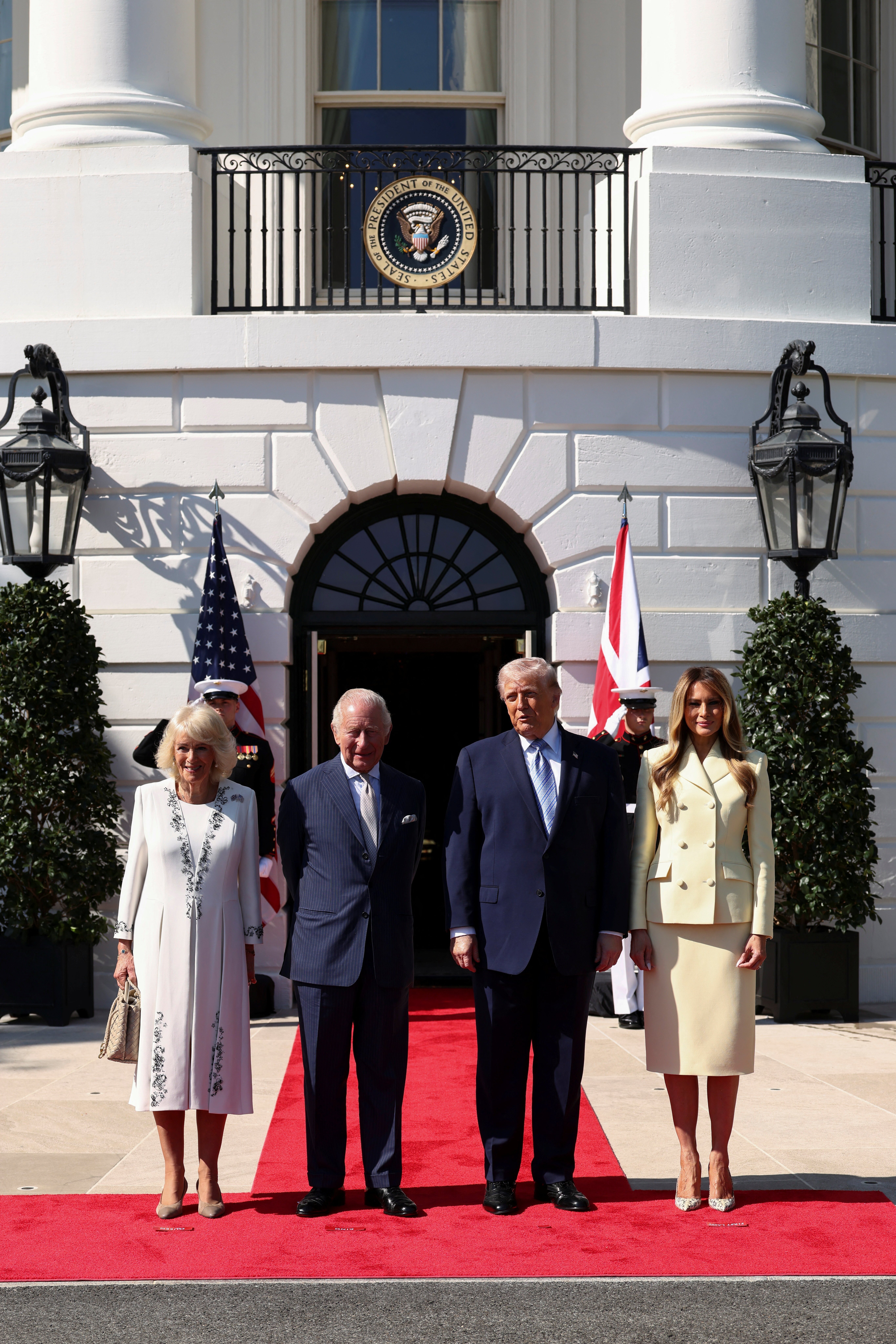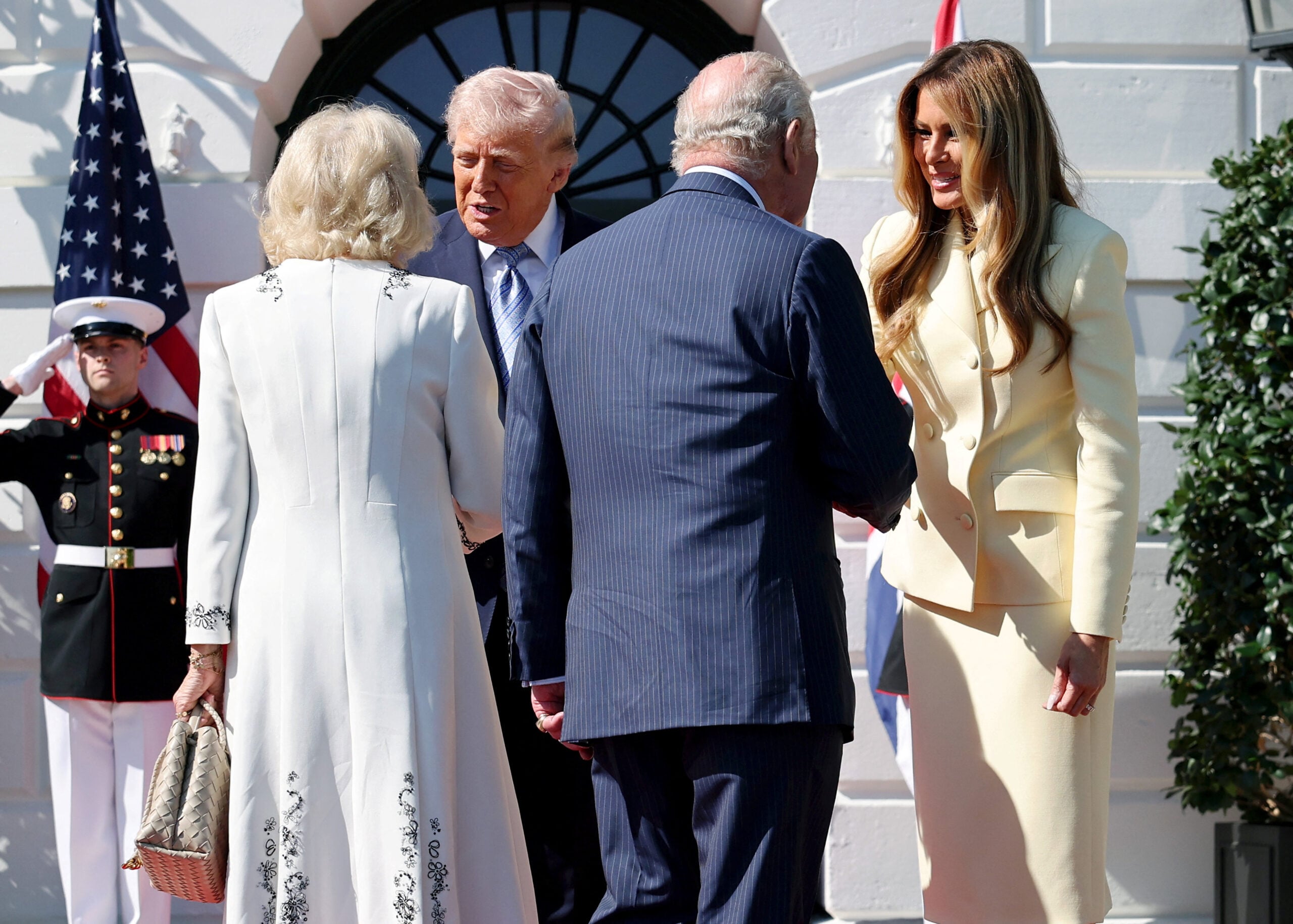 Αργότερα το ζεύγος Τραμπ τους υποδέχθηκε στον Λευκό Οίκο! Εδώ η εμφάνιση της Πρώτης Κυρίας ξεχώρισε για μία ακόμη φορά, η οποία επέλεξε ένα ταγέρ σε butter yellow απόχρωση, δίνοντας μια πιο φωτεινή, ανοιξιάτικη νότα στο σκηνικό, ενώ οι animal print γόβες πρόσθεσαν μια διακριτική fashion-forward πινελιά.Ενώ η βασίλισσα Καμίλα επέλεξε ένα white co-ord με embellished floral σχέδια στο πανωφόρι.