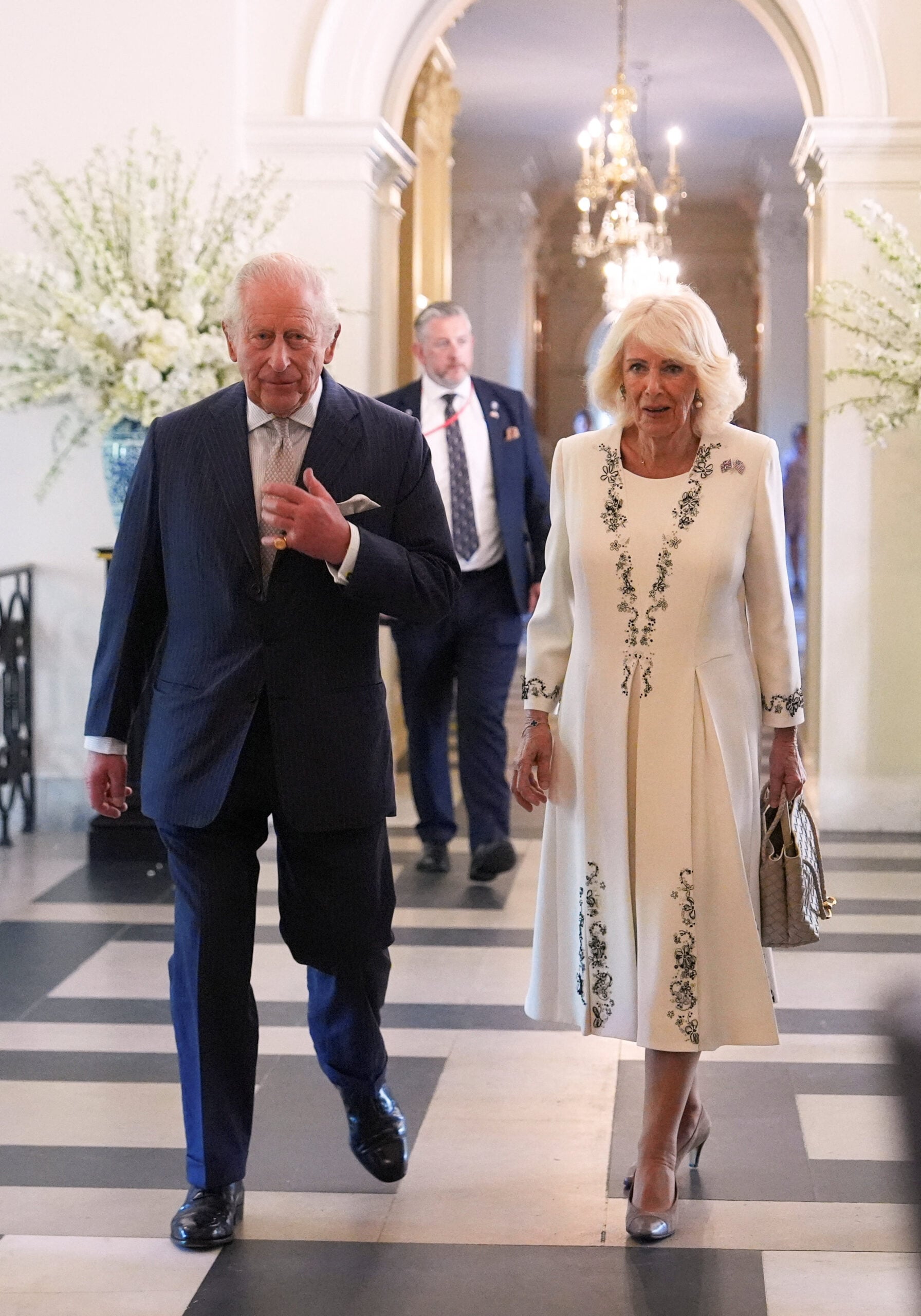 Κατά την άφιξη στο αεροδρόμιο η Βασίλισσα Καμίλα έκλεψε τις εντυπώσεις ήδη από την άφιξη, επιλέγοντας ένα ροζ coat dress από τον οίκο Dior, το οποίο συνδύασε με μια εντυπωσιακή καρφίτσα από Cartier.