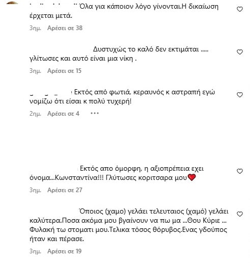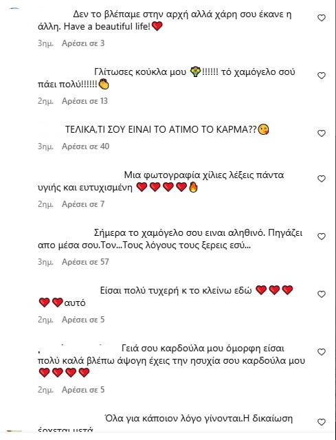 Σχόλια στην ανάρτησή της στο Instagram υπαινίσσονταν ότι «γλίτωσε» από την προηγούμενη σχέση της, χωρίς εκείνη να απαντήσει. Το θέμα συζητήθηκε και στην εκπομπή "Κοινωνία Ώρα Mega".