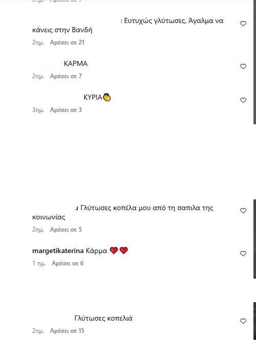 Η πρώην σύζυγος του Βασίλη Μπισμπίκη ανέβασε μια selfie φωτογραφία της πριν από τρεις μέρες στον λογαριασμό της στο instagram. Στην εν λόγω φωτογραφία, πολλοί ήταν εκείνοι που χωρίς να αναφέρουν το όνομα του ηθοποιού, έσπευσαν να σχολιάσουν γράφοντας ότι, «γλίτωσε» και πως, «το κάρμα μίλησε», με την ίδια να μη δίνει καμιά περεταίρω απάντηση στα σχόλια αυτά.