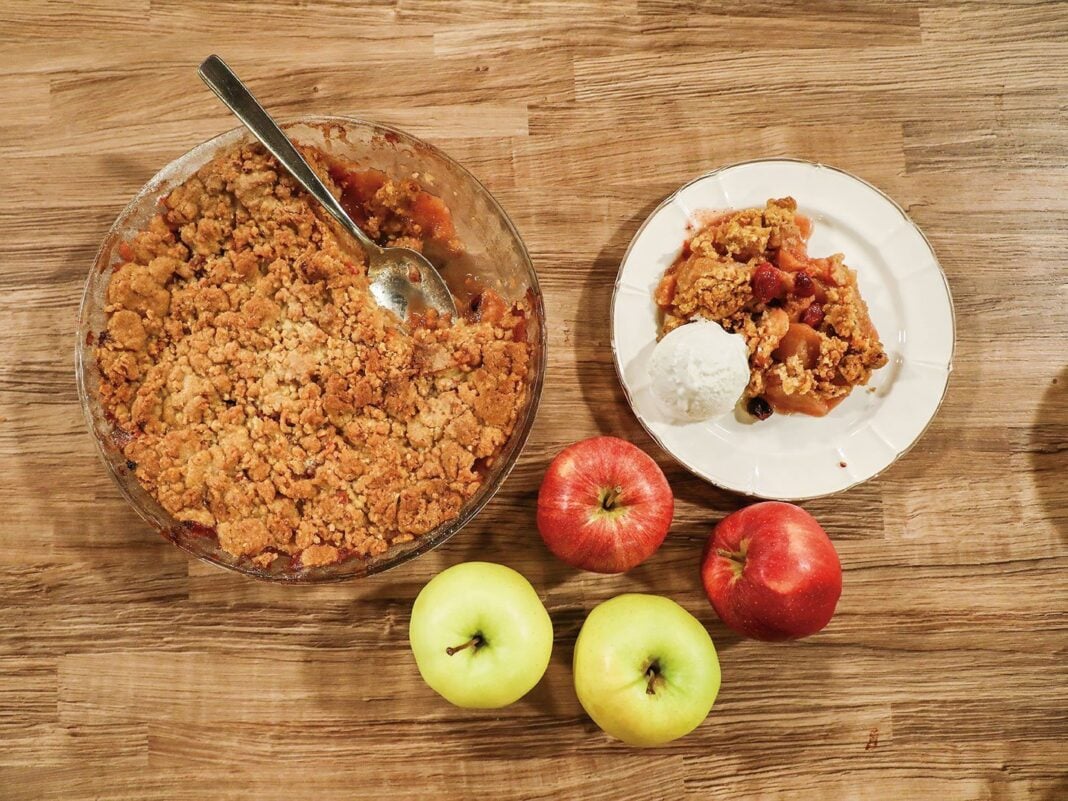 Ετοιμάζετε το κραμπλ. Βάζετε τα δύο είδη από τη ζάχαρη , τα καρύδια, την κανέλα και τη βανίλια σε ένα food processor και αλέθετε. Προσθέτετε το αλεύρι και το βούτυρο και αλέθετε ξανά μέχρι να σχηματιστεί ένα μείγμα σαν μικρά μπιζέλια.