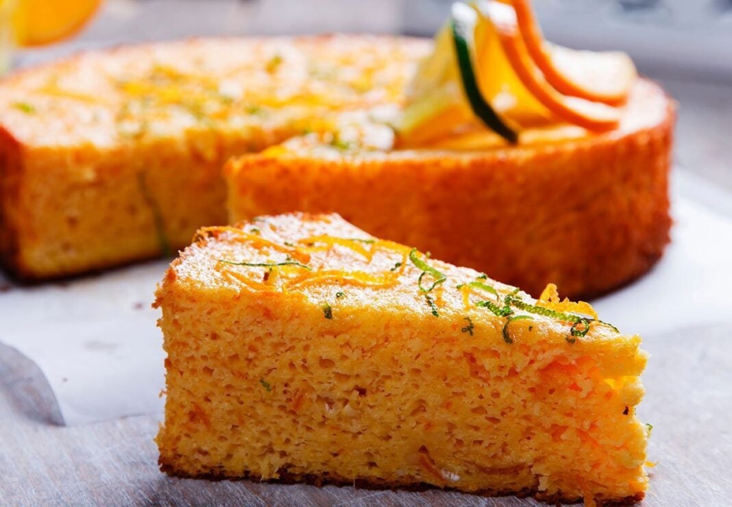 Τα ξαναστραγγίζετε, τα τεμαχίζετε, πετάτε τα κουκούτσια τους και τα αλέθετε στο πολυμίξερ μέχρι να γίνουν λείος πουρές. Χτυπάτε με το μίξερ τα αβγά με τη ζάχαρη μέχρι να ξασπρίσουν και να γίνουν σαν κρέμα. Ύστερα, ανακατεύετε μέσα ελαφρά τα αλεσμένα πορτοκάλια, τα αμύγδαλα, το μπέικιν πάουντερ, την κανέλα και το κάρδαμο (ή τα ανάμικτα μπαχαρικά), μέχρι να ομογενοποιηθεί το μίγμα. Το αδειάζετε στη φόρμα και ισιώνετε την επιφάνειά του.
