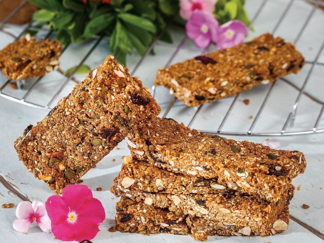 Περιχύνετε στο μπολ με τα υπόλοιπα υλικά. Προσθέτετε τα αποξηραμένα φρούτα και ανακατεύετε καλά. Μεταφέετε το μίγμα στο ταψί και το απλώνετε να πάει παντού. Καλύπτετε με ένα αντικολλητικό χαρτί και πιέζετε με τα χέρια σας μέχρι να δημιουργηθεί ένα πιο συμπαγές ορθογώνιο.