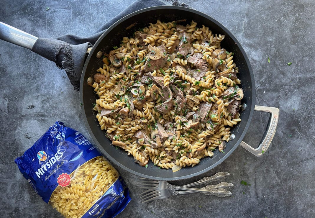 • Η συνταγή συνδυάζει βοδινό κρέας με ζυμαρικά fussili και πλούσια σάλτσα από κρεμμύδια, σκόρδο και μανιτάρια.