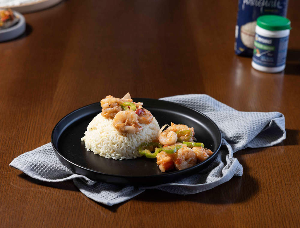 - Το πιάτο σερβίρεται με το ρύζι ως βάση και τις γαρίδες από πάνω, προσφέροντας έντονες γεύσεις.