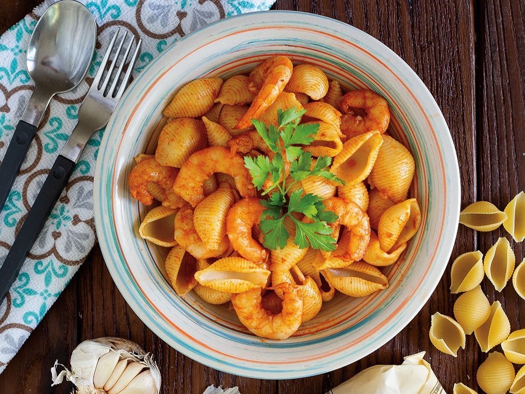 • Η συνταγή περιλαμβάνει γαρίδες, ελαιόλαδο, σκόρδο, γλυκιά πάπρικα και μακαρόνια κοχύλια.