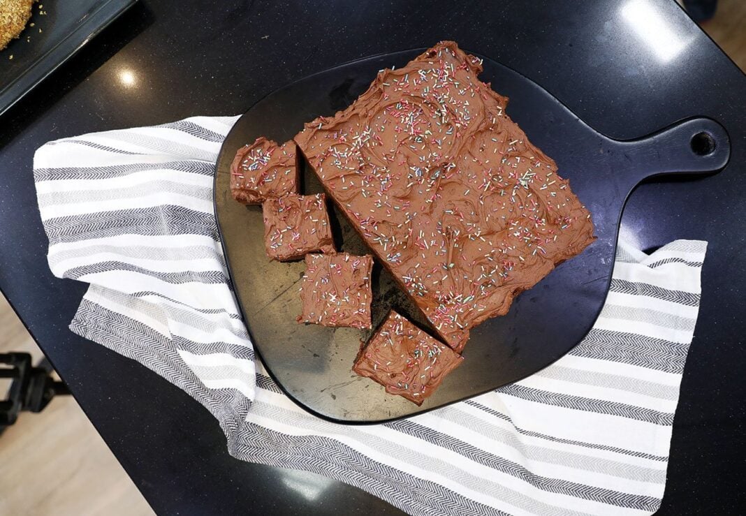 Μεταφέρετε το μίγμα σε ένα ταψί για μπράουνι στο οποίο έχετε βάλει αντικολλητικό χαρτί. Ψήνετε στους 160 βαθμούς στον αέρα για 30-35 λεπτά.