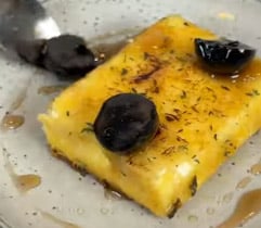 - Η φέτα τηγανίζεται με μαργαρίνη και θυμάρι μέχρι να γίνει τραγανή και ροδοκόκκινη.