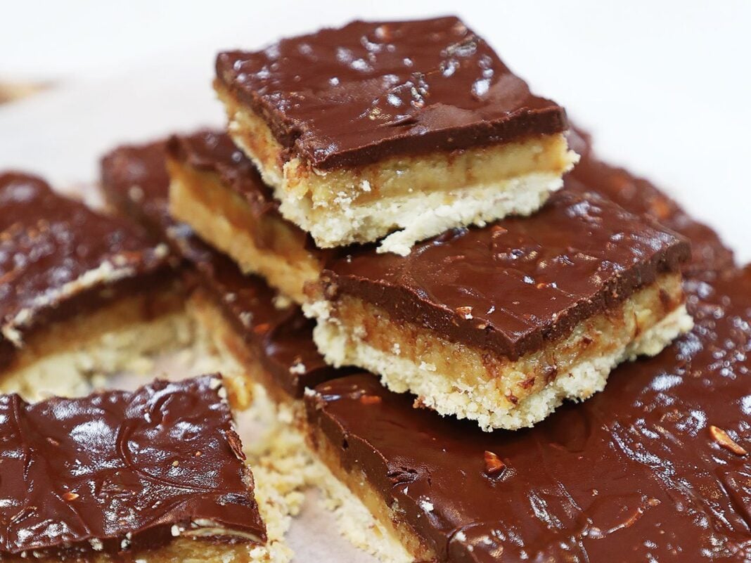 Το άρθρο περιγράφει τη συνταγή για καραμελένιες μπάρες με σοκολατένια επικάλυψη, αναφέροντας τα υλικά που χρειάζονται για τη βάση, την καραμέλα και την επικάλυψη, καθώς και την αναλυτική διαδικασία παρασκευής τους. Για τη βάση, χρησιμοποιούνται αλεύρι, αμύγδαλα, ζάχαρη, βούτυρο και βανίλια, ενώ η καραμέλα φτιάχνεται με ζαχαρούχο γάλα και μαύρη ζάχαρη.