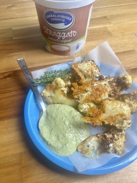 Ψήνουμε για 15 λεπτά στους 190 βαθμους – ο χρόνος ποικίλλει ανάλογα με του κουνουπίδι. Βγάζουμε από το ταψί και σερβίρουμε με το ντίπ γιαουρτιού.