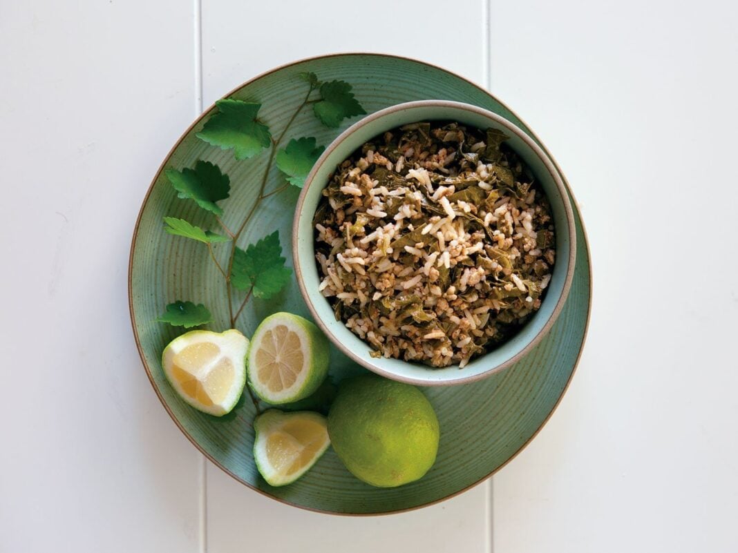 Προσθέτουμε στη συνέχεια το ρύζι και 400 γρ. ζεστό νερό. Ψήνουμε σε χαμηλή φωτιά για 15’ ακόμα. Αφήνουμε το φαγητό να ξεκουραστεί και να αφομοιωθούν οι γεύσεις και τα αρώματα και σερβίρουμε.