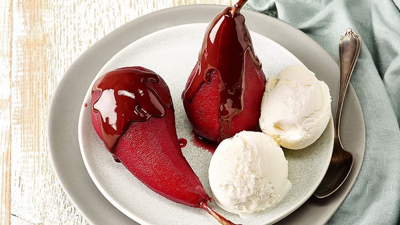 - Η συνταγή περιλαμβάνει σιγοβράσιμο αχλαδιών σε κόκκινο κρασί με κανέλα και βανίλια.