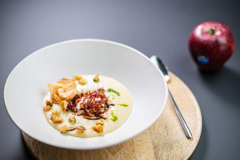 Σερβίρισμα: Ρίξτε την κρέμα σε πιάτο ή μπολ. Τοποθετήστε από πάνω ένα ποσέ αυγό. Πασπαλίστε με λωρίδες ζαμπόν και κύβους ψωμιού ψημένου. Διακοσμήστε με τα άνθη Red Delicious και λίγες σταγόνες λάδι μαϊντανού.
