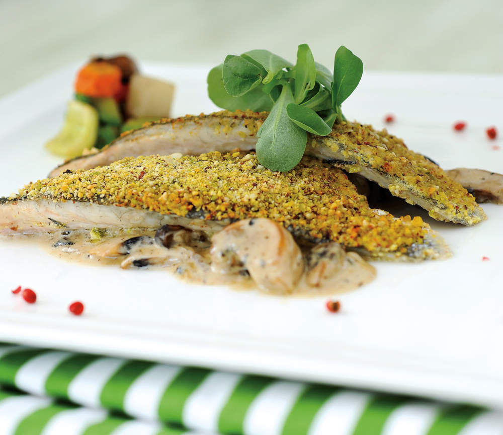 Τα φιλέτα λαβράκι καλύπτονται με μείγμα γαλέτας και χαλεπιανών, ψήνονται στο φούρνο και σερβίρονται με μια σάλτσα από μανιτάρια, κρεμμύδι, μάραθο, ούζο και κρέμα γάλακτος.