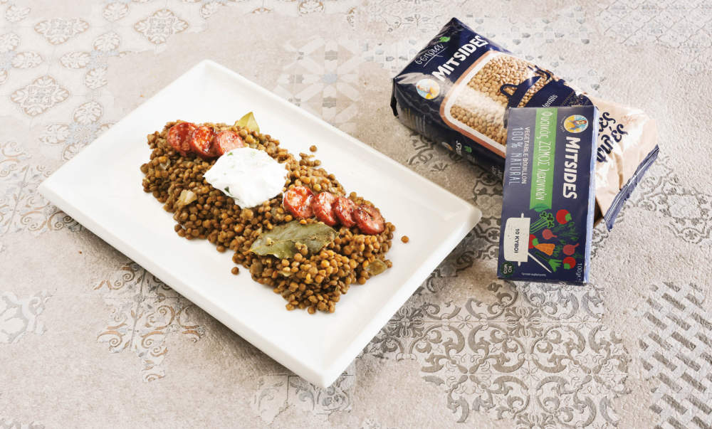 - Η συνταγή περιγράφει την προετοιμασία ενός πιάτου με λουκάνικο και φακές, εμπλουτισμένο με αρωματικά μπαχαρικά.